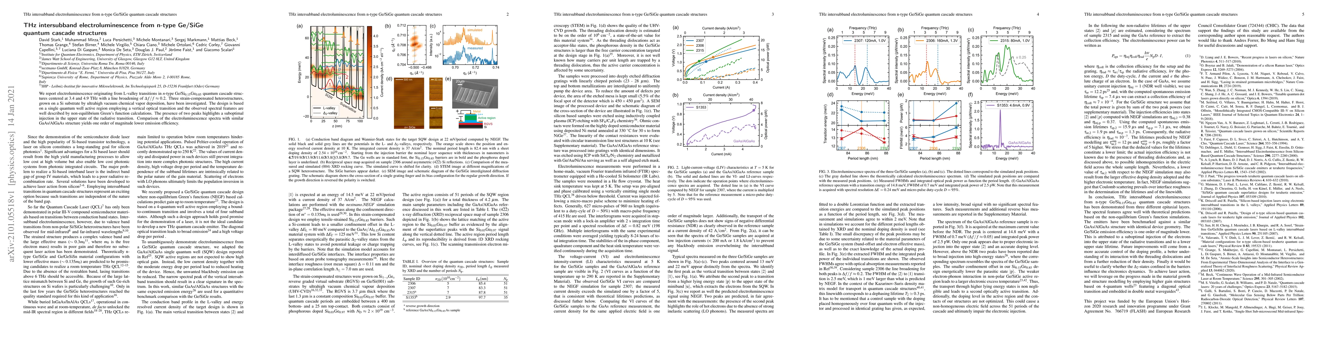 This paper reports on the electroluminescence from n-type Ge/SiGe quantum cascade structures, showing THz emissions at 3.4 and 4.9 THz due to L-valley transitions, with a notable lower emission efficiency compared to GaAs/AlGaAs counterparts. The study employs non-equilibrium Green's function calculations to explain the observed spectral features.
