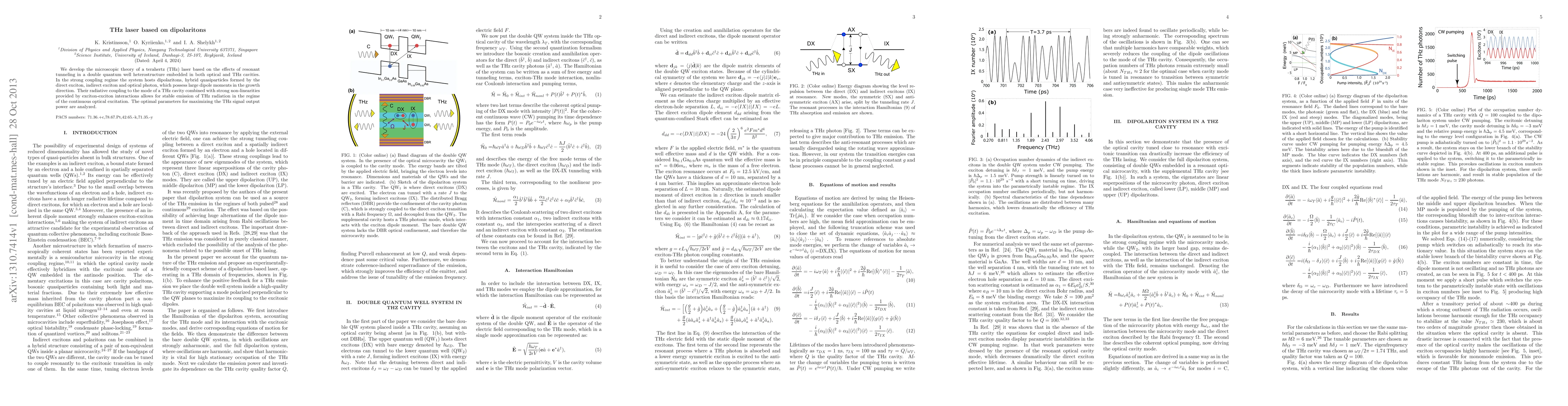 We develop the microscopic theory of a terahertz (THz) laser based on the effects of resonant tunneling in a double quantum well heterostructure embedded in both optical and THz cavities. In the strong coupling regime the system hosts dipolaritons, hybrid quasiparticles formed by the direct exciton, indirect exciton and optical photon, which possess large dipole moments in the growth direction. Their radiative coupling to the mode of a THz cavity combined with strong non-linearities provided by exciton-exciton interactions allows for stable emission of THz radiation in the regime of the continuous optical excitation. The optimal parameters for maximizing the THz signal output power are analyzed.