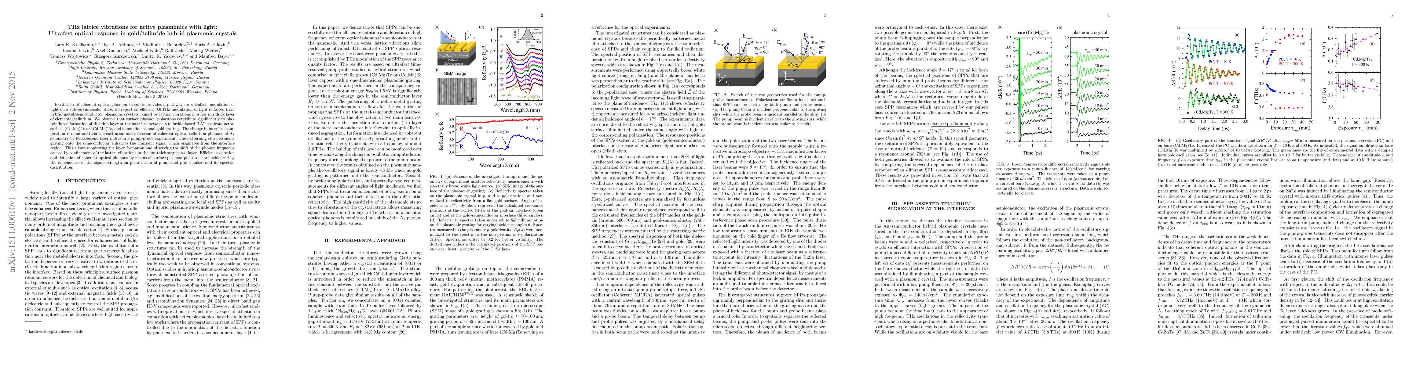 Excitation of coherent optical phonons in solids provides a pathway for ultrafast modulation of light on a sub-ps timescale. Here, we report on efficient 3.6 THz modulation of light reflected from hybrid metal/semiconductor plasmonic crystals caused by lattice vibrations in a few nm thick layer of elemental tellurium. We observe that surface plasmon polaritons contribute significantly to photoinduced formation of this thin layer at the interface between a telluride-based II-VI semiconductor, such as (Cd,Mg)Te or (Cd,Mn)Te, and a one-dimensional gold grating. The change in interface composition is monitored via the excitation and detection of coherent optical tellurium phonons of $A_1$ symmetry by femtosecond laser pulses in a pump-probe experiment. The patterning of a plasmonic grating onto the semiconductor enhances the transient signal which originates from the interface region. This allows monitoring the layer formation and observing the shift of the phonon frequency caused by confinement of the lattice vibrations in the nm-thick segregated layer. Efficient excitation and detection of coherent optical phonons by means of surface plasmon polaritons are evidenced by the dependence of the signal strength on polarization of pump and probe pulses and its spectral distribution.