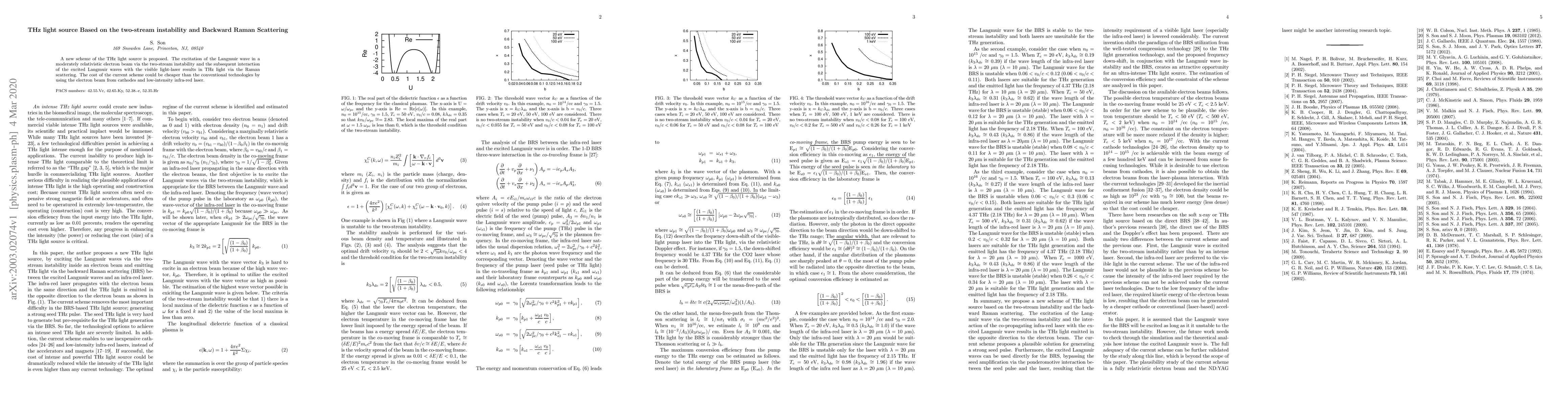 Summary: This paper proposes a cost-effective THz light source utilizing the two-stream instability to excite Langmuir waves in relativistic electron beams, which then interact with visible light lasers to generate THz radiation via backward Raman scattering, potentially offering a cheaper alternative to conventional technologies.
