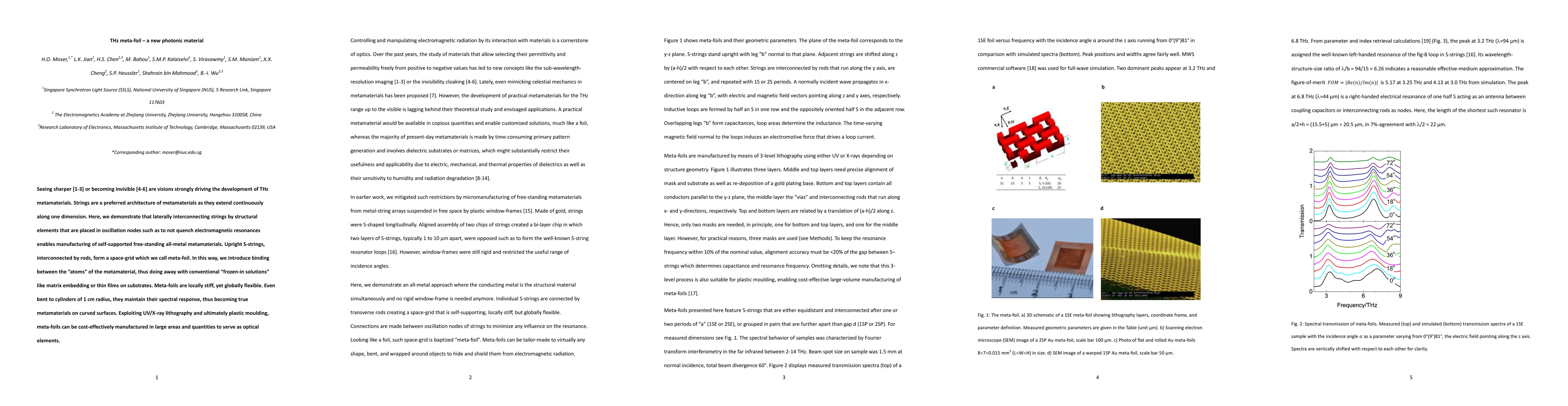 Seeing sharper or becoming invisible are visions strongly driving the development of THz metamaterials. Strings are a preferred architecture of metamaterials as they extend continuously along one dimension. Here, we demonstrate that laterally interconnecting strings by structural elements that are placed in oscillation nodes such as to not quench electromagnetic resonances enables manufacturing of self-supported free-standing all-metal metamaterials. Upright S-strings, interconnected by rods, form a space-grid which we call meta-foil. In this way, we introduce binding between the "atoms" of the metamaterial, thus doing away with conventional "frozen-in solutions" like matrix embedding or thin films on substrates. Meta-foils are locally stiff, yet globally flexible. Even bent to cylinders of 1 cm radius, they maintain their spectral response, thus becoming true metamaterials on curved surfaces. Exploiting UV/X-ray lithography and ultimately plastic moulding, meta-foils can be cost-effectively manufactured in large areas and quantities to serve as optical elements.