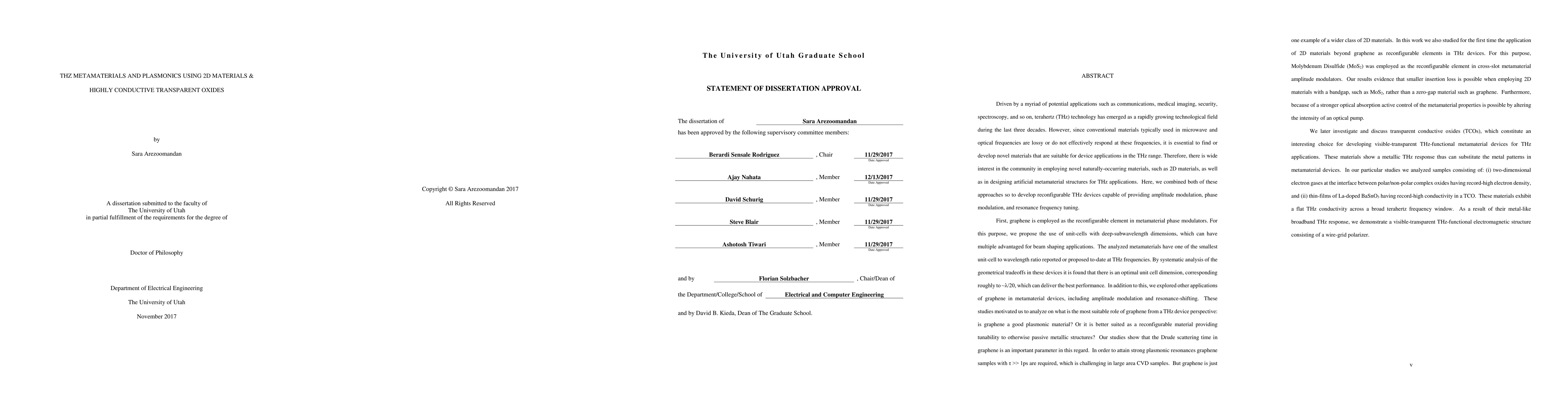 Driven by a myriad of potential applications such as communications, medical imaging, security, spectroscopy, and so on, terahertz (THz) technology has emerged as a rapidly growing technological field during the last three decades. However, since conventional materials typically used in microwave and optical frequencies are lossy or do not effectively respond at these frequencies, it is essential to find or develop novel materials that are suitable for device applications in the THz range. Therefore, there is wide interest in the community in employing novel naturally-occurring materials, such as 2D materials, as well as in designing artificial metamaterial structures for THz applications. Here, we combined both of these approaches so to develop reconfigurable THz devices capable of providing amplitude modulation, phase modulation, and resonance frequency tuning.