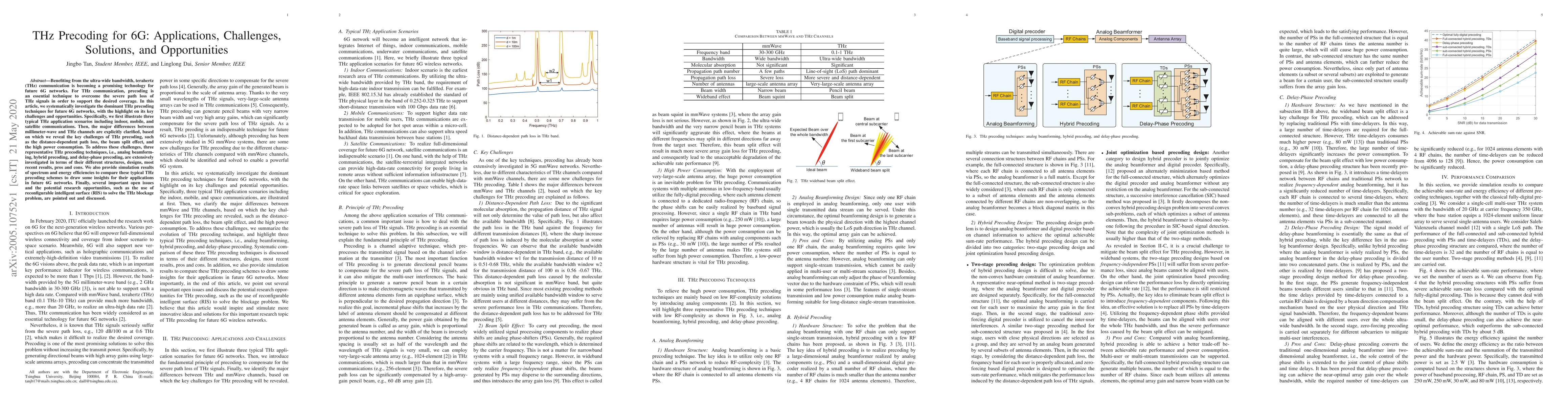 This paper explores THz precoding techniques for future 6G networks, focusing on overcoming THz signal path loss challenges. It examines three main THz precoding methods—analog beamforming, hybrid precoding, and delay-phase precoding—evaluating their structures, designs, and efficiencies. It also discusses open issues and potential research opportunities, such as using reconfigurable intelligent surfaces to mitigate THz blockage.