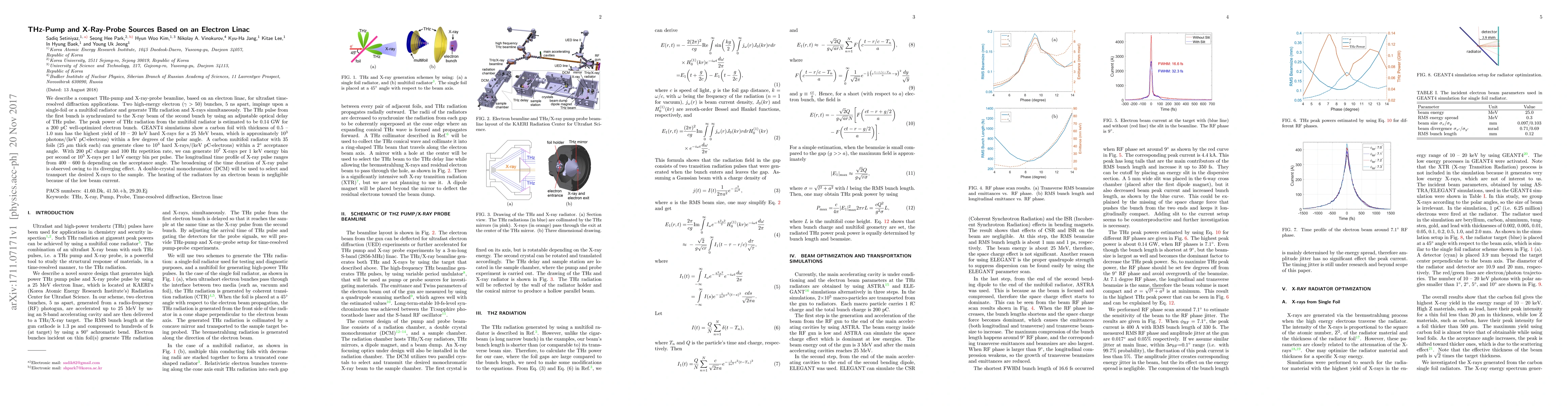 We describe a compact THz-pump and X-ray-probe beamline, based on an electron linac, for ultrafast time-resolved diffraction applications. Two high-energy electron ($\gamma>50$) bunches, $5~$ns apart, impinge upon a single-foil or a multifoil radiator and generate THz radiation and X-rays simultaneously. The THz pulse from the first bunch is synchronized to the X-ray beam of the second bunch by using an adjustable optical delay of THz pulse. The peak power of THz radiation from the multifoil radiator is estimated to be $0.14~$GW for a $200~$pC well-optimized electron bunch. GEANT4 simulations show a carbon foil with thickness of $0.5~-~1.0~$mm has the highest yield of $10~-~20~$keV hard X-rays for a $25~$MeV beam, which is approximately $10^3$ photons/(keV pC-electrons) within a few degrees of the polar angle. A carbon multifoil radiator with $35$ foils ($25~$$\mu m~$thick each) can generate close to $10^3$ hard X-rays/(keV pC-electrons) within a $2^\circ$ acceptance angle. With $200~$pC charge and $100~$Hz repetition rate, we can generate $10^7$ X-rays per $1~$keV energy bin per second or $10^5$ X-rays per $1~$keV energy bin per pulse. The longitudinal time profile of X-ray pulse ranges from $400~-~600~$fs depending on the acceptance angle. The broadening of the time duration of X-ray pulse is observed owing to its diverging effect. A double-crystal monochromator (DCM) will be used to select and transport the desired X-rays to the sample. The heating of the radiators by an electron beam is negligible because of the low beam current.