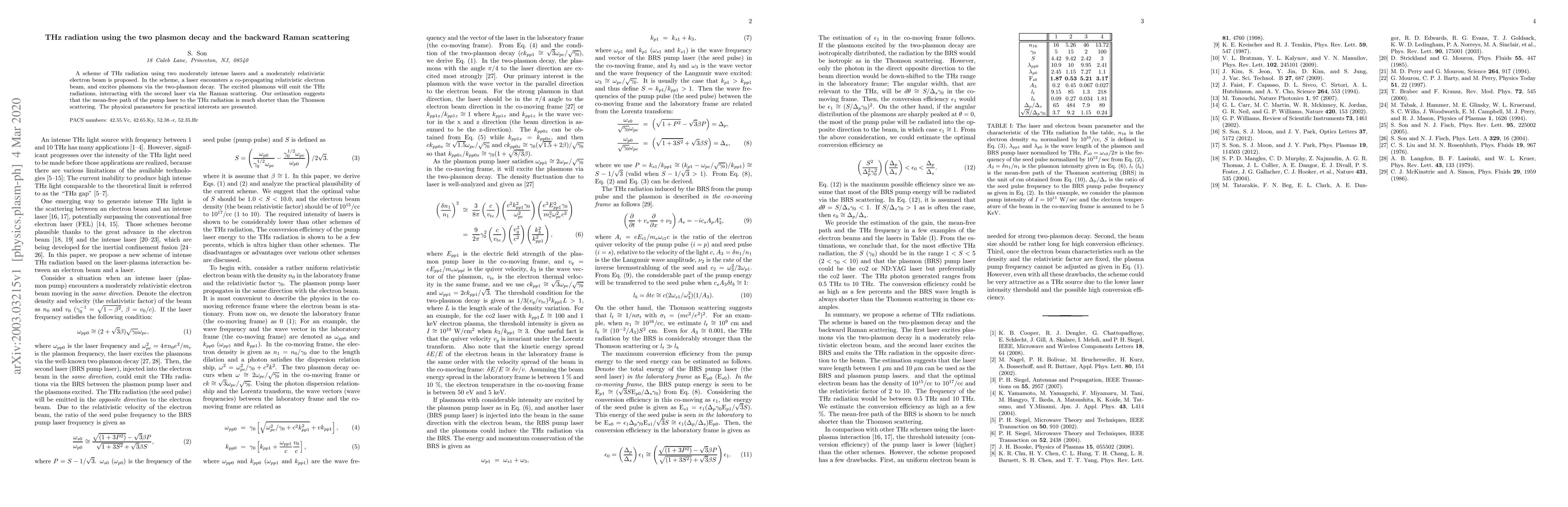 This paper proposes a method for generating THz radiation using two moderately intense lasers and a relativistic electron beam, where plasmons excited by the first laser decay and emit THz radiation, which then interacts with a second laser via Raman scattering. The scheme is estimated to have a shorter mean-free-path compared to Thomson scattering.