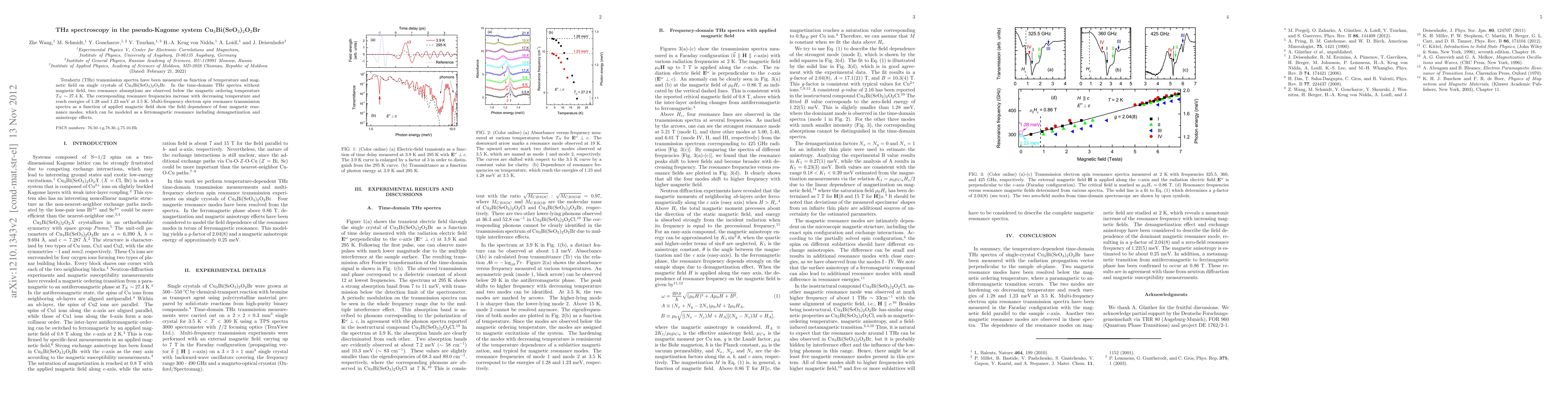Terahertz (THz) transmission spectra have been measured as function of temperature and magnetic field on single crystals of Cu3Bi(SeO3)2O2Br. In the time-domain THz spectra without magnetic field, two resonance absorptions are observed below the magnetic ordering temperature T_N~27.4 K. The corresponding resonance frequencies increase with decreasing temperature and reach energies of 1.28 and 1.23 meV at 3.5 K. Multi-frequency electron spin resonance transmission spectra as a function of applied magnetic field show the field dependence of four magnetic resonance modes, which can be modeled as a ferromagnetic resonance including demagnetization and anisotropy effects.