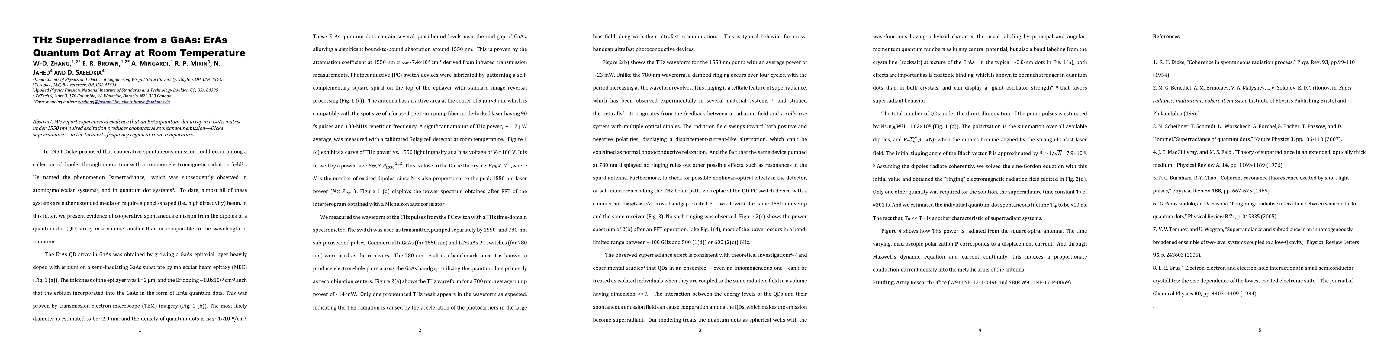 We report experimental evidence that an ErAs quantum-dot array in a GaAs matrix under 1550 nm pulsed excitation produces cooperative spontaneous emission-Dicke superradiance-in the terahertz frequency region at room temperature.