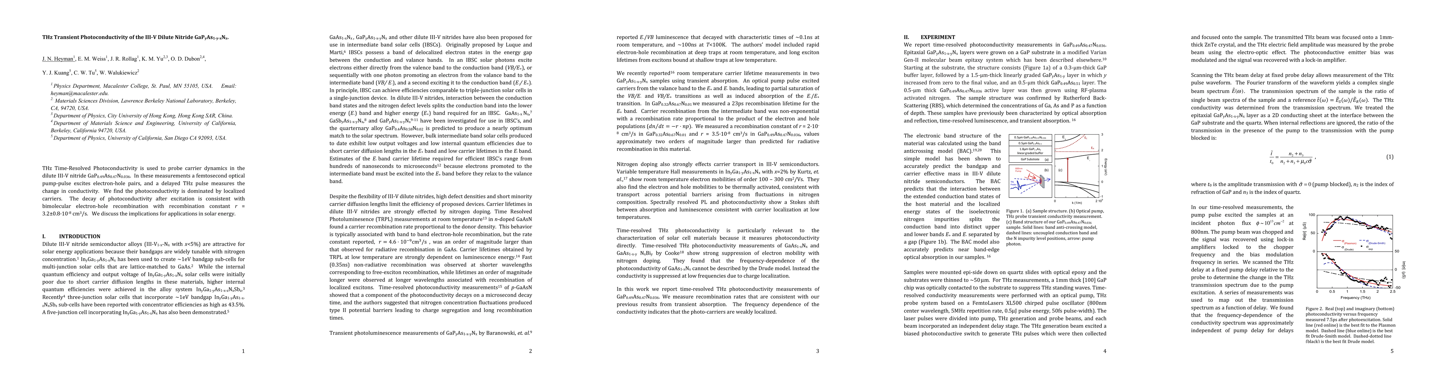 Researchers studied THz transient photoconductivity in GaPAsN, a dilute III-V nitride, finding localized carriers dominate the effect. They measured recombination rates, indicating potential applications in solar energy.