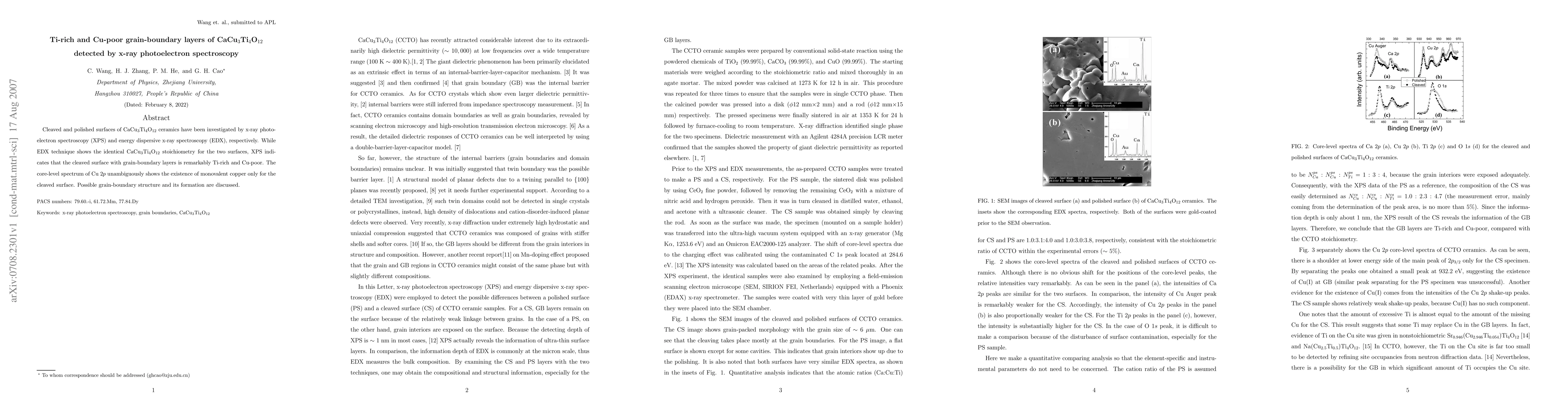 This study uses XPS to reveal that grain-boundary layers in CaCu$_3$Ti$_4$O$_{12}$ ceramics are Ti-rich and Cu-poor, contrasting with EDX results showing uniform stoichiometry. The presence of monovalent copper is detected only on the cleaved surface, suggesting distinct grain-boundary chemistry.