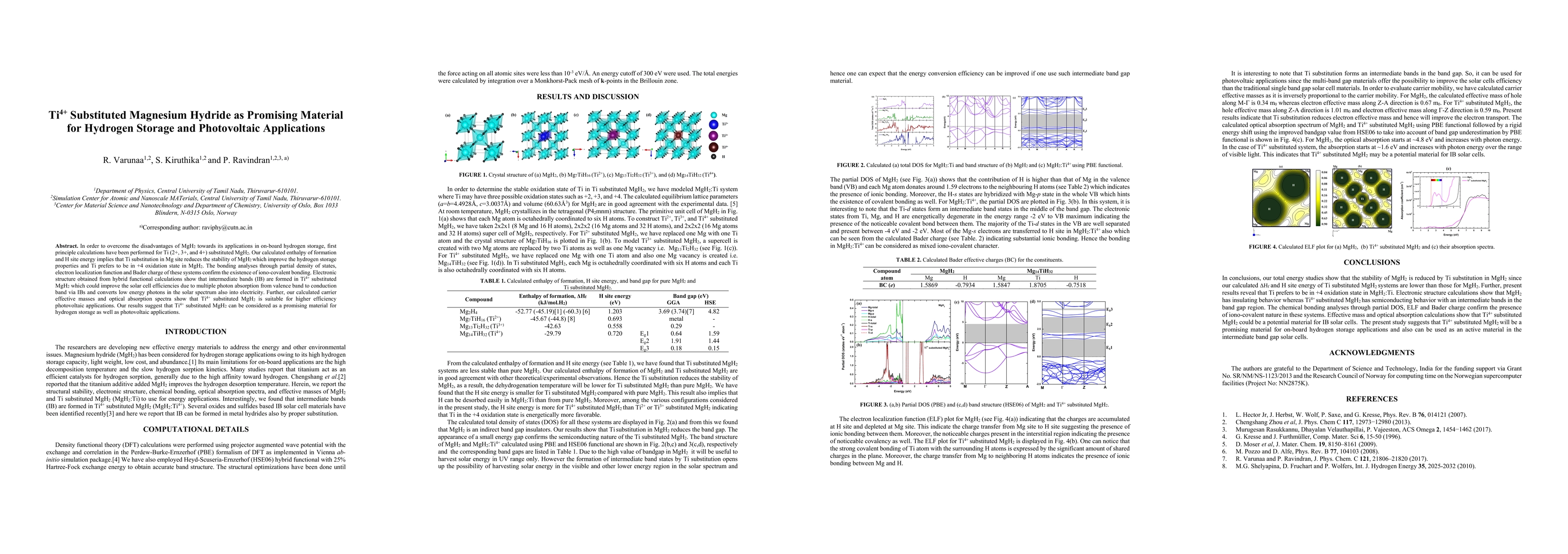 Researchers discovered a new material, Ti4+ substituted magnesium hydride, that shows promise for both hydrogen storage and photovoltaic applications due to its improved stability and unique electronic structure.