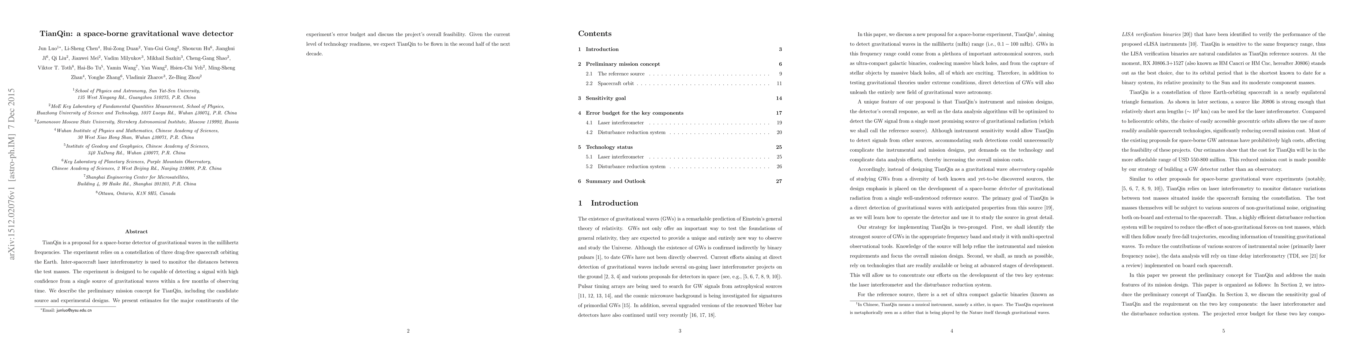 TianQin is a proposed space-based gravitational wave detector targeting millihertz frequencies, utilizing three drag-free spacecraft and laser interferometry. The mission aims to detect gravitational waves from a single source within a few months, with a focus on feasibility and technology readiness for a potential launch in the next decade.