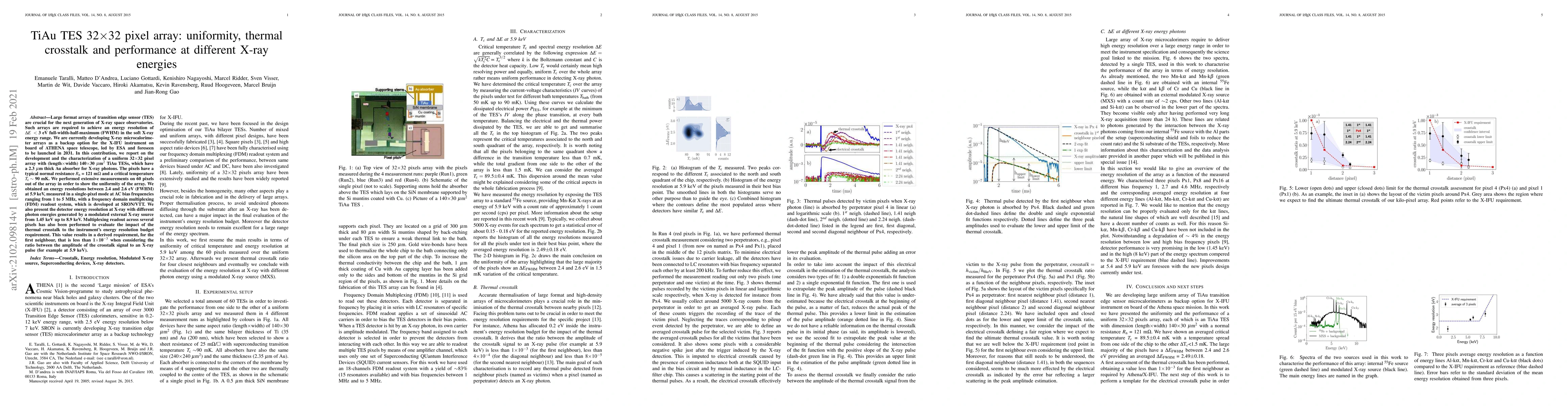 The paper details the development and characterization of a 32x32 pixel TiAu Transition Edge Sensor (TES) array for future X-ray space observatories. With 140x30 mum^2 TESs and 2.3 mum Au absorbers, the array demonstrates uniform energy resolutions between 2.4 and 2.6 eV (FWHM) at 5.9 keV. The study also evaluates thermal crosstalk impact, setting a requirement of less than 1x10^-3 for the first neighbour's ratio between crosstalk and X-ray pulse amplitude.