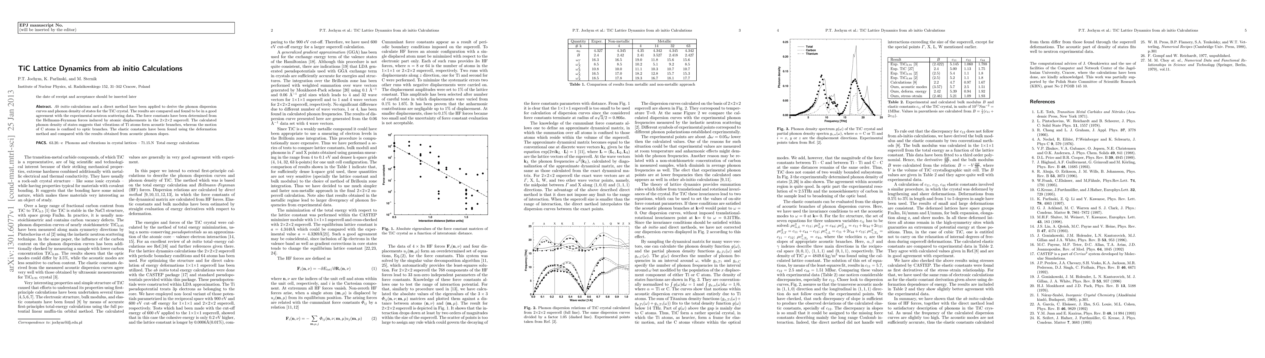 This paper uses ab initio calculations to determine the phonon dispersion curves and density of states for TiC, showing good agreement with experimental data. The analysis reveals that Ti atoms primarily form acoustic branches, while C atoms form optic branches, and the calculated elastic constants are verified through acoustic phonon slopes.