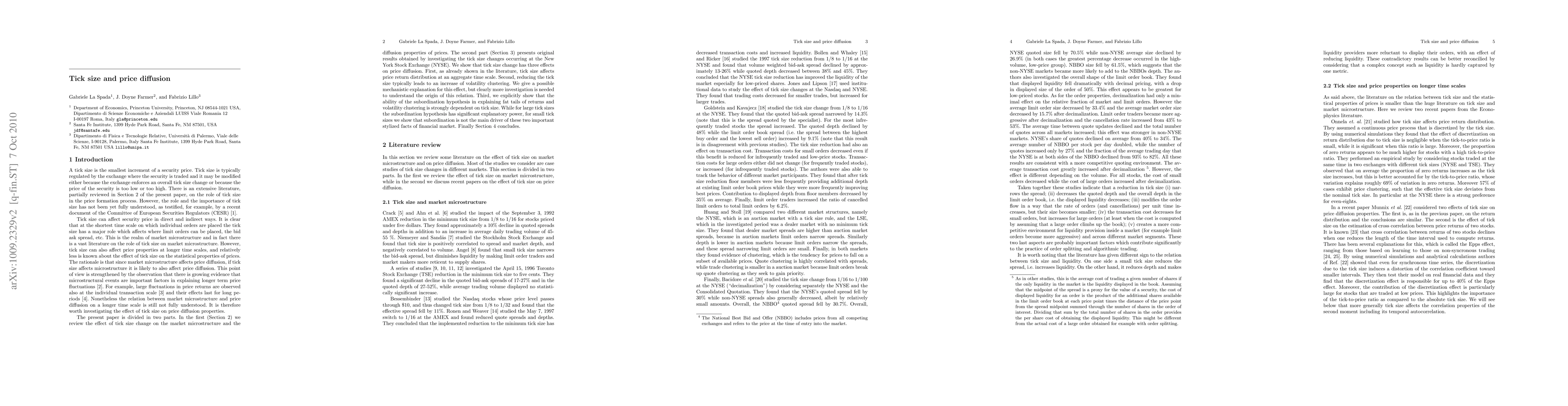 A tick size is the smallest increment of a security price. It is clear that at the shortest time scale on which individual orders are placed the tick size has a major role which affects where limit orders can be placed, the bid-ask spread, etc. This is the realm of market microstructure and there is a vast literature on the role of tick size on market microstructure. However, tick size can also affect price properties at longer time scales, and relatively less is known about the effect of tick size on the statistical properties of prices. The present paper is divided in two parts. In the first we review the effect of tick size change on the market microstructure and the diffusion properties of prices. The second part presents original results obtained by investigating the tick size changes occurring at the New York Stock Exchange (NYSE). We show that tick size change has three effects on price diffusion. First, as already shown in the literature, tick size affects price return distribution at an aggregate time scale. Second, reducing the tick size typically leads to an increase of volatility clustering. We give a possible mechanistic explanation for this effect, but clearly more investigation is needed to understand the origin of this relation. Third, we explicitly show that the ability of the subordination hypothesis in explaining fat tails of returns and volatility clustering is strongly dependent on tick size. While for large tick sizes the subordination hypothesis has significant explanatory power, for small tick sizes we show that subordination is not the main driver of these two important stylized facts of financial market.