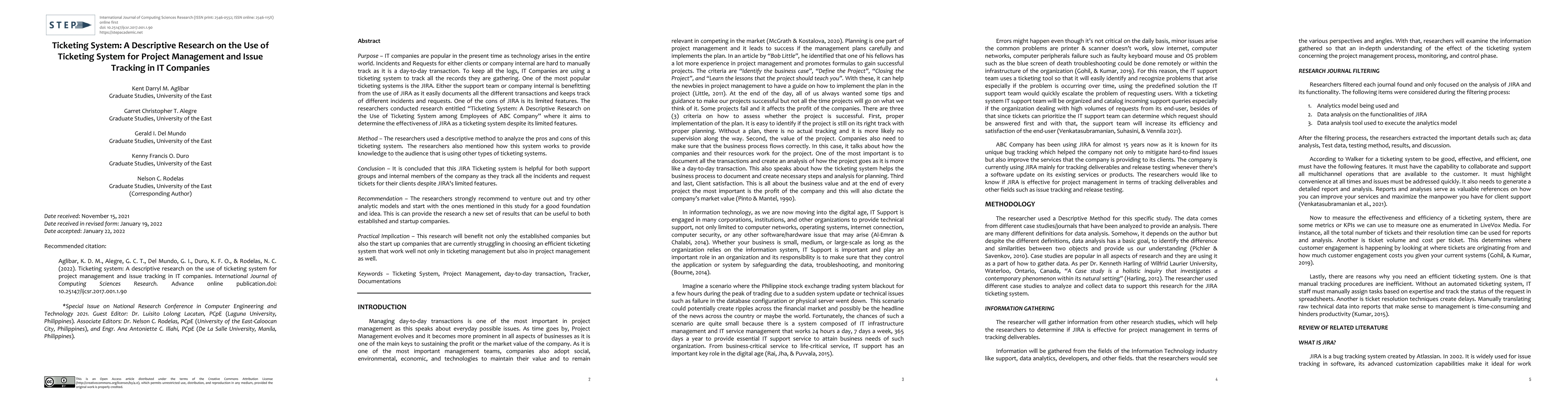 This research examines the use of JIRA as a ticketing system in IT companies for project management and issue tracking, highlighting its benefits for documenting transactions and tracking incidents despite its limited features. The study concludes that JIRA is effective for both support teams and internal company members, recommending further exploration of alternative analytical models.