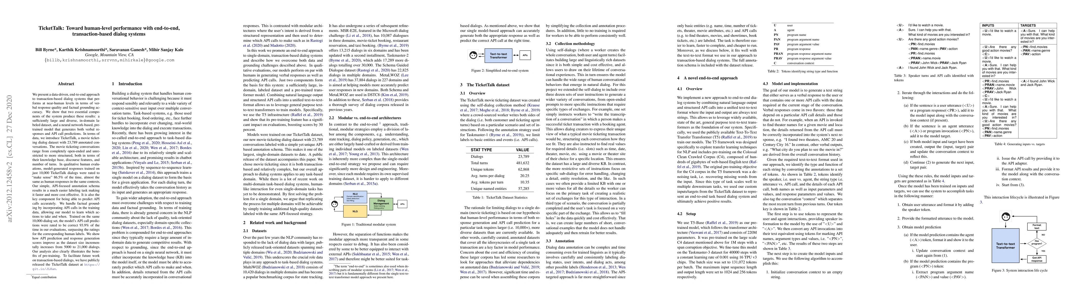 We present a data-driven, end-to-end approach to transaction-based dialog systems that performs at near-human levels in terms of verbal response quality and factual grounding accuracy. We show that two essential components of the system produce these results: a sufficiently large and diverse, in-domain labeled dataset, and a neural network-based, pre-trained model that generates both verbal responses and API call predictions. In terms of data, we introduce TicketTalk, a movie ticketing dialog dataset with 23,789 annotated conversations. The movie ticketing conversations range from completely open-ended and unrestricted to more structured, both in terms of their knowledge base, discourse features, and number of turns. In qualitative human evaluations, model-generated responses trained on just 10,000 TicketTalk dialogs were rated to "make sense" 86.5 percent of the time, almost the same as human responses in the same contexts. Our simple, API-focused annotation schema results in a much easier labeling task making it faster and more cost effective. It is also the key component for being able to predict API calls accurately. We handle factual grounding by incorporating API calls in the training data, allowing our model to learn which actions to take and when. Trained on the same 10,000-dialog set, the model's API call predictions were rated to be correct 93.9 percent of the time in our evaluations, surpassing the ratings for the corresponding human labels. We show how API prediction and response generation scores improve as the dataset size incrementally increases from 5000 to 21,000 dialogs. Our analysis also clearly illustrates the benefits of pre-training. We are publicly releasing the TicketTalk dataset with this paper to facilitate future work on transaction-based dialogs.