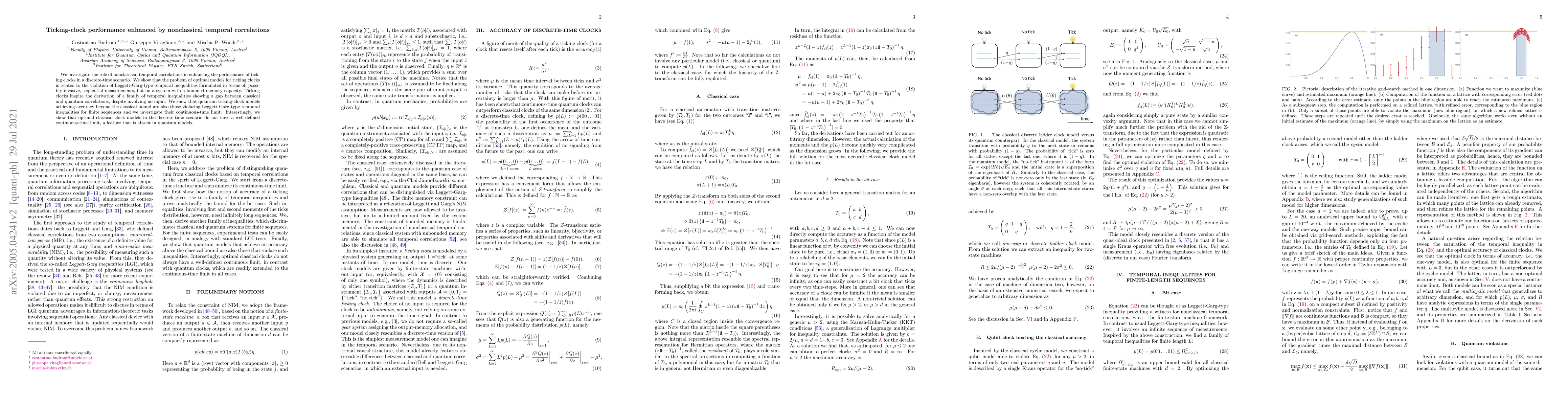Summary: The paper explores how nonclassical temporal correlations can improve the precision of ticking clocks in discrete-time scenarios by violating Leggett-Garg-type temporal inequalities. Quantum models that exceed classical accuracy also violate these inequalities for finite sequences, and the continuous-time limit of these quantum models differs from that of classical models.