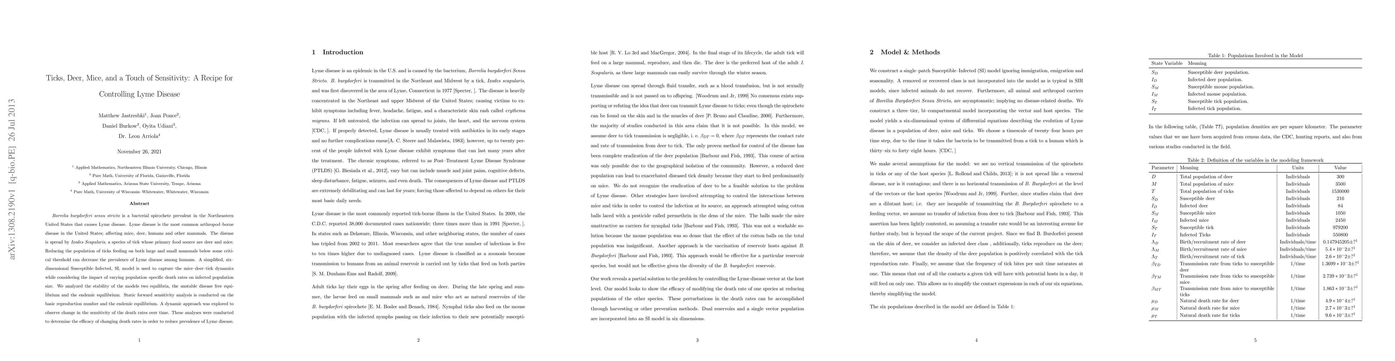 Borrelia burgdorferi sensu stricto is a bacterial spirochete prevalent in the Northeastern United States that causes Lyme disease. Lyme disease is the most common arthropod-borne disease in the United States; affecting mice, deer, humans and other mammals. The disease is spread by Ixodes Scapularis, a species of tick whose primary food source are deer and mice. Reducing the population of ticks feeding on both large and small mammals below some critical threshold can decrease the prevalence of Lyme disease among humans. A simplified, six-dimensional Susceptible-Infected, SI, model is used to capture the mice-deer-tick dynamics while considering the impact of varying population-specific death rates on infected population size. We analyzed the stability of the models two equilibria, the unstable disease free equilibrium and the endemic equilibrium. Static forward sensitivity analysis is conducted on the basic reproduction number and the endemic equilibrium. A dynamic approach was explored to observe change in the sensitivity of the death rates over time. These analyses were conducted to determine the efficacy of changing death rates in order to reduce prevalence of Lyme disease.