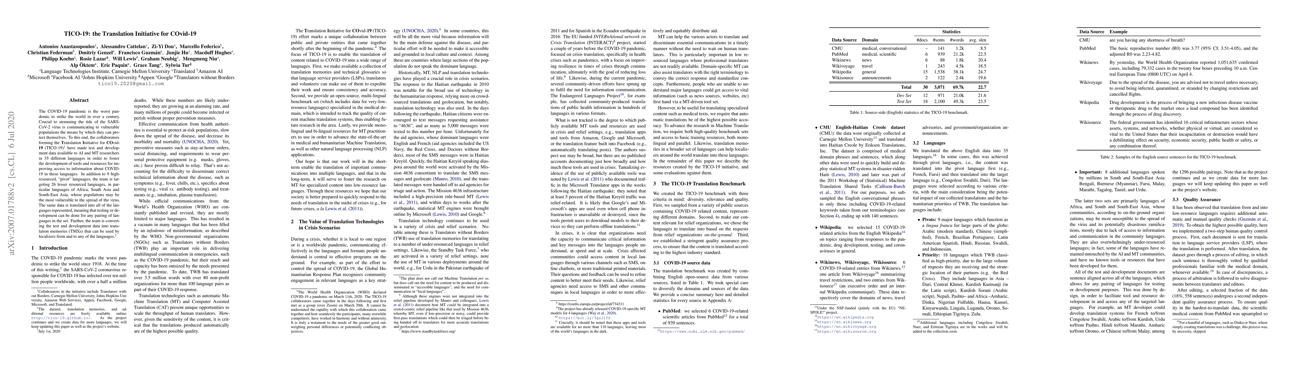 The COVID-19 pandemic is the worst pandemic to strike the world in over a century. Crucial to stemming the tide of the SARS-CoV-2 virus is communicating to vulnerable populations the means by which they can protect themselves. To this end, the collaborators forming the Translation Initiative for COvid-19 (TICO-19) have made test and development data available to AI and MT researchers in 35 different languages in order to foster the development of tools and resources for improving access to information about COVID-19 in these languages. In addition to 9 high-resourced, "pivot" languages, the team is targeting 26 lesser resourced languages, in particular languages of Africa, South Asia and South-East Asia, whose populations may be the most vulnerable to the spread of the virus. The same data is translated into all of the languages represented, meaning that testing or development can be done for any pairing of languages in the set. Further, the team is converting the test and development data into translation memories (TMXs) that can be used by localizers from and to any of the languages.