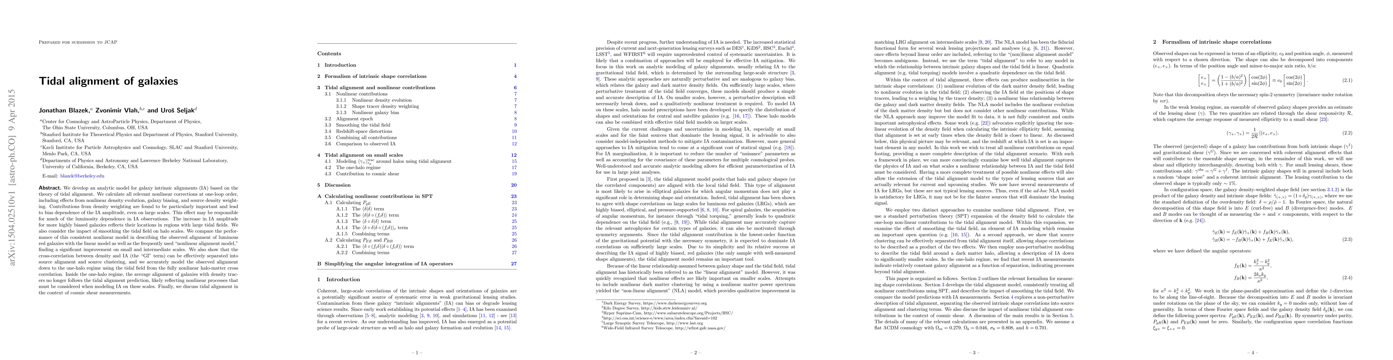 The paper presents a comprehensive one-loop order nonlinear model for galaxy intrinsic alignments, incorporating density weighting, galaxy biasing, and source density effects, and demonstrates its superior performance over existing models on small and intermediate scales.