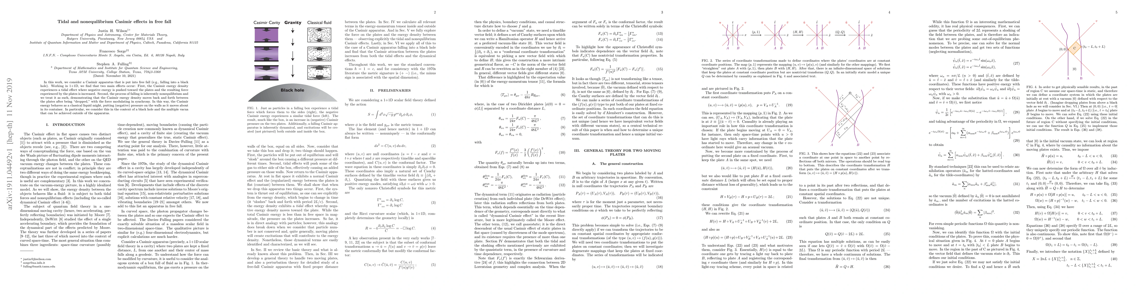 In this work, we consider a Casimir apparatus that is put into free fall (e.g., falling into a black hole). Working in 1+1D, we find that two main effects occur: First, the Casimir energy density experiences a tidal effect where negative energy is pushed toward the plates and the resulting force experienced by the plates is increased. Second, the process of falling is inherently nonequilibrium and we treat it as such, demonstrating that the Casimir energy density moves back and forth between the plates after being "dropped,'' with the force modulating in synchrony. In this way, the Casimir energy behaves as a classical liquid might, putting (negative) pressure on the walls as it moves about in its container. In particular, we consider this in the context of a black hole and the multiple vacua that can be achieved outside of the apparatus.