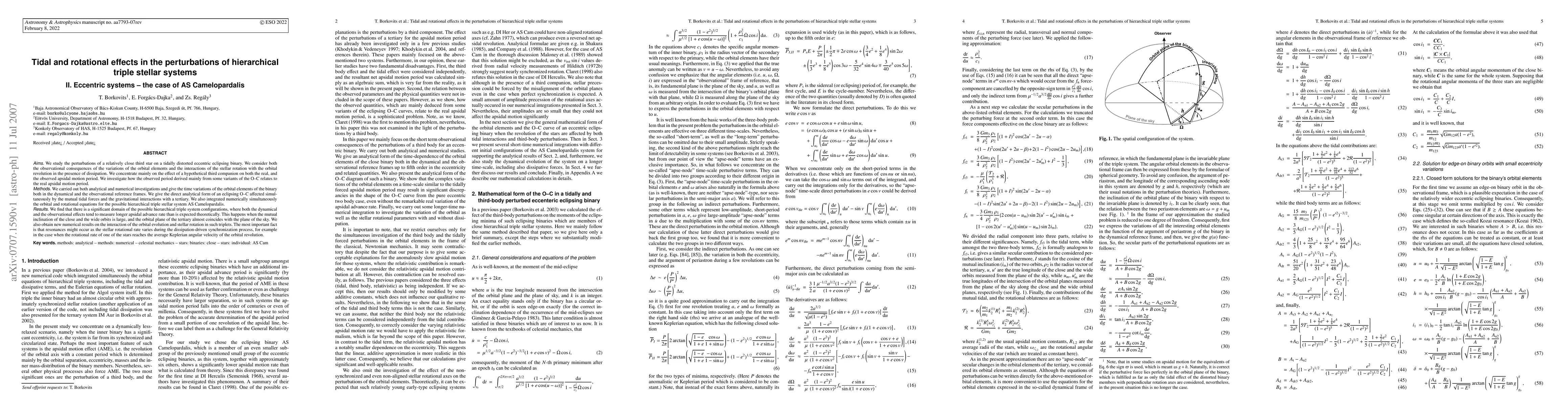 This paper investigates the perturbations in a hierarchical triple stellar system, focusing on the tidally distorted eccentric binary AS Camelopardalis. It examines the influence of a third star on the orbital and rotational dynamics, revealing that significant discrepancies arise in the measured apsidal motion period when the mutual inclination is large and the tertiary's orbit aligns with the plane of the sky.