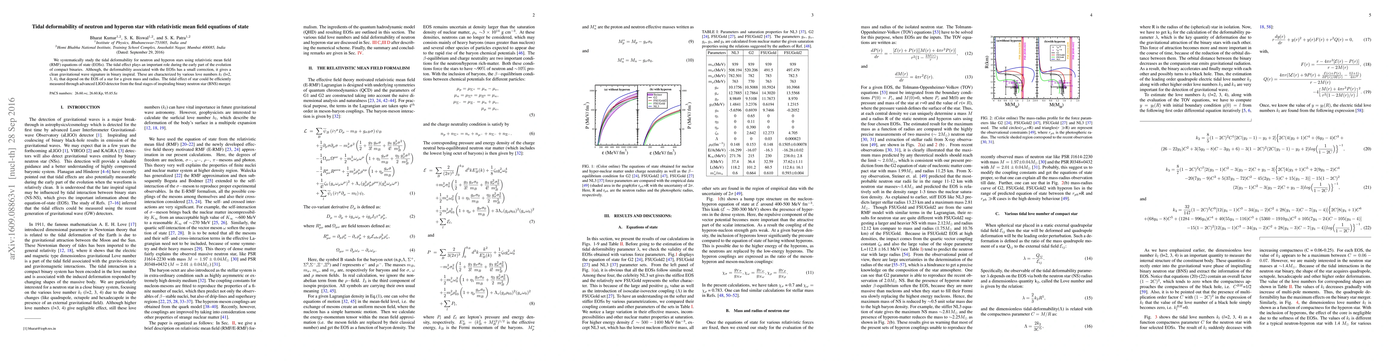 We systematically study the tidal deformability for neutron and hyperon stars using relativistic mean field (RMF) equations of state (EOSs). The tidal effect plays an important role during the early part of the evolution of compact binaries. Although, the deformability associated with the EOSs has a small correction, it gives a clean gravitational wave signature in binary inspiral. These are characterized by various love numbers kl (l=2, 3, 4), that depend on the EOS of a star for a given mass and radius. The tidal effect of star could be efficiently measured through advanced LIGO detector from the final stages of inspiraling binary neutron star (BNS) merger.