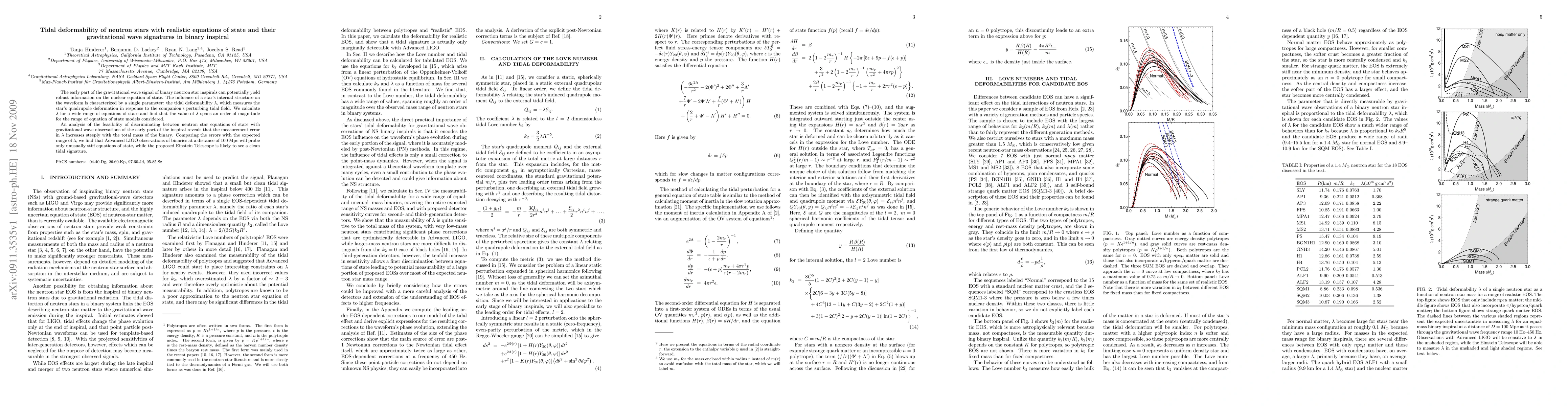 This paper investigates the tidal deformability of neutron stars across various realistic equations of state and its impact on gravitational wave signatures during binary neutron star inspirals. It finds that the tidal deformability spans an order of magnitude, and while Advanced LIGO may only probe stiff equations of state, the Einstein Telescope could provide clearer tidal signatures.