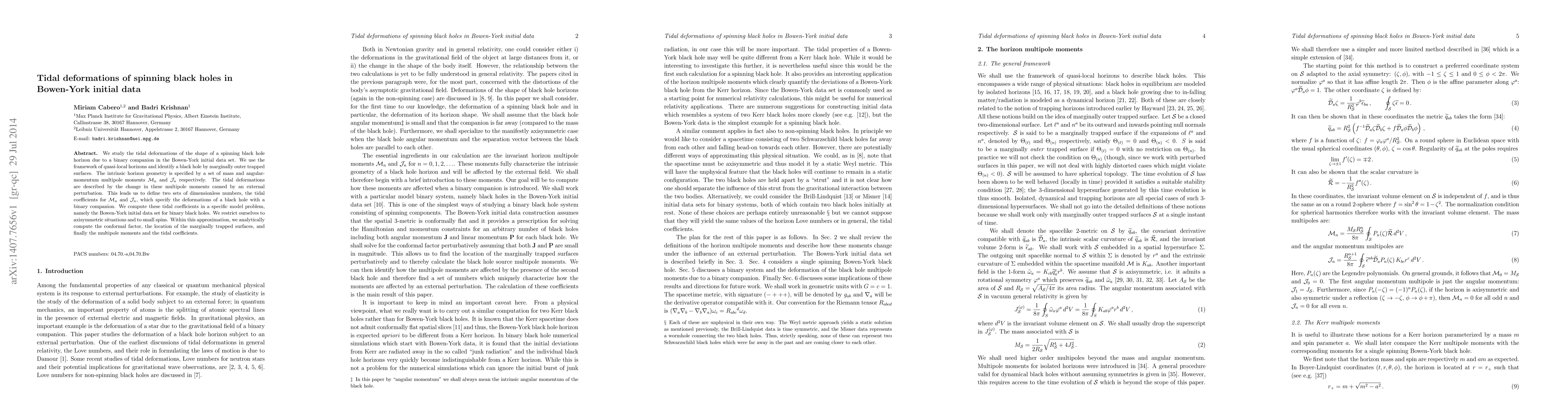 This paper investigates the tidal deformations of spinning black holes in the Bowen-York initial data set due to a binary companion, using quasi-local horizons and multipole moments to describe the intrinsic geometry. It computes tidal coefficients that quantify the deformations, focusing on axisymmetric, small-spin scenarios.