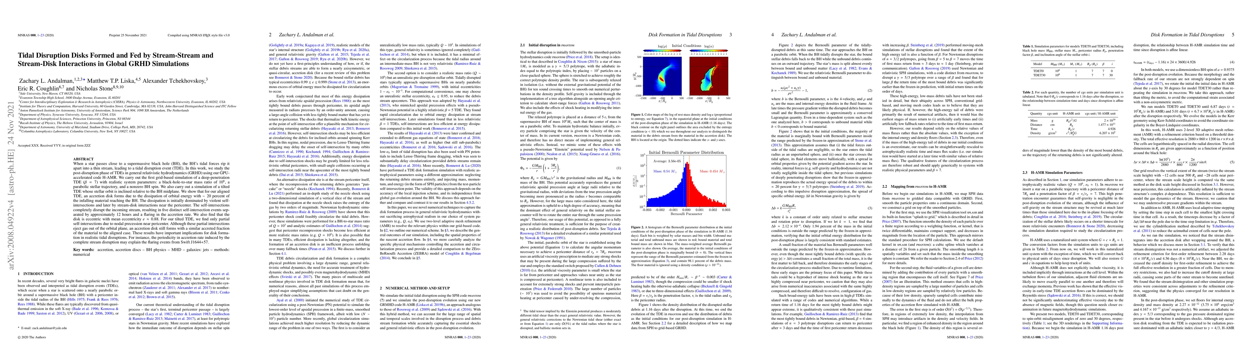 This paper uses global GRHD simulations to study tidal disruption disks formed after stars pass close to supermassive black holes. It finds that complete stream disruptions lead to periodic flaring in accretion rates, while tilted disruptions still form eccentric disks with similar accreted material fractions.