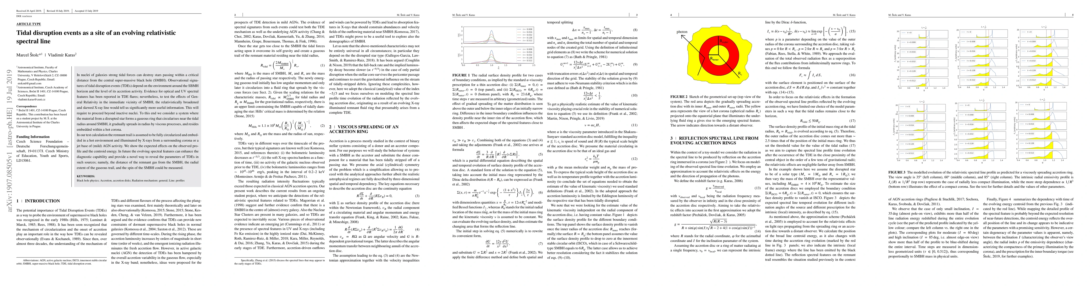 In nuclei of galaxies strong tidal forces can destroy stars passing within a critical distance from the central super-massive black hole (SMBH). Observational signatures of tidal disruption events (TDEs) depend on the environment around the SBMH horizon and the level of its accretion activity. Evidence for optical and UV spectral features has been reported in TDE flares; nevertheless, to test the effects of General Relativity in the immediate vicinity of SMBH, the relativistically broadened and skewed X-ray line would tell us significantly more useful information. This will require to proceed beyond inactive nuclei. To this end we consider a system where the material from a disrupted star forms a gaseous ring that circularises near the tidal radius around SMBH, it gradually spreads in radius by viscous processes, and resides embedded within a hot corona. In our test calculation the remnant trail is assumed to be fully circularized and embedded in a hot environment and illuminated by X-rays from a surrounding corona or a jet base of (mild) AGN activity. We show the expected effects on the observed profile and the centroid energy. In future the evolving spectral features can enhance the diagnostic capability and provide a novel way to reveal the parameters of TDEs in such sources; namely, the distance of the remnant gas from the SMBH, the radial extent of the gaseous trail, and the spin of the SMBH could be measured.