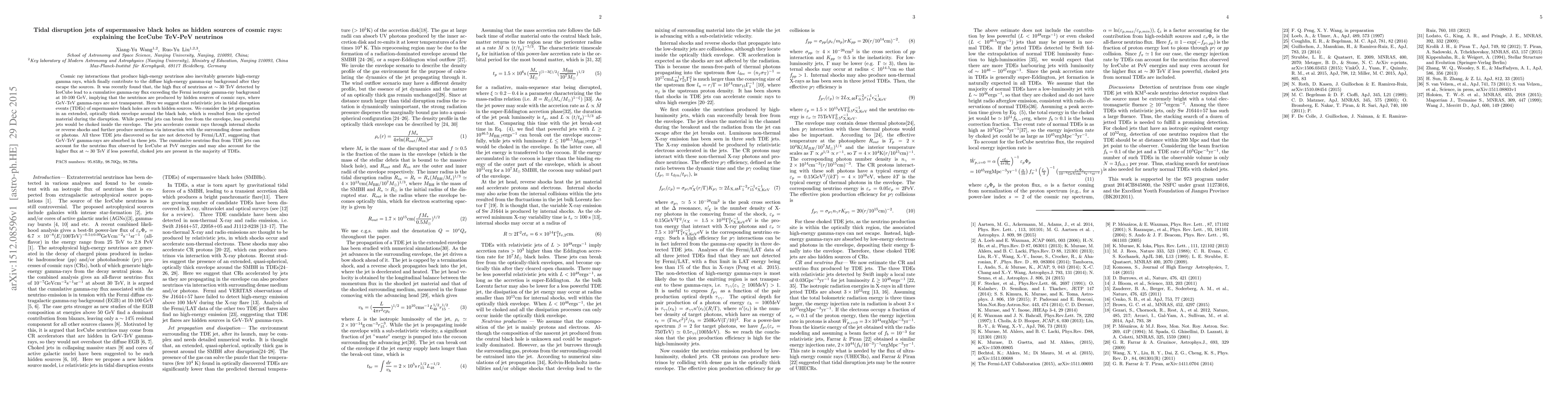 This paper proposes that tidal disruption events (TDEs) of supermassive black holes, through their relativistic jets, are hidden sources of cosmic rays that generate high-energy neutrinos detected by IceCube. These jets, especially less powerful ones, trap GeV-TeV gamma rays, explaining the excess gamma-ray flux observed and suggesting the jets could account for the observed neutrino flux at TeV-PeV energies.