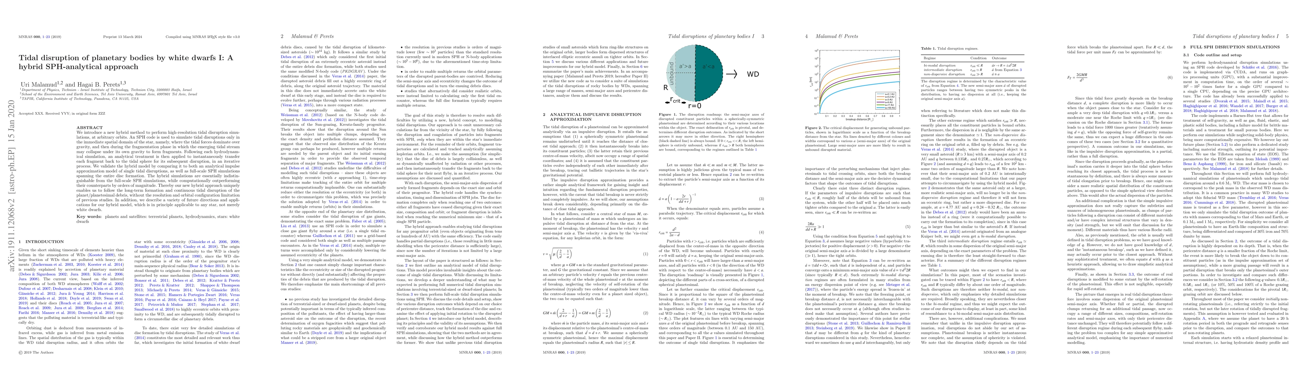 This paper introduces a new hybrid method for simulating tidal disruption of planetary bodies by white dwarfs, combining SPH simulations for high-resolution hydrodynamics with analytical treatments for efficiency. The hybrid model is validated against full-scale SPH simulations and shows comparable accuracy while being significantly more computationally efficient.
