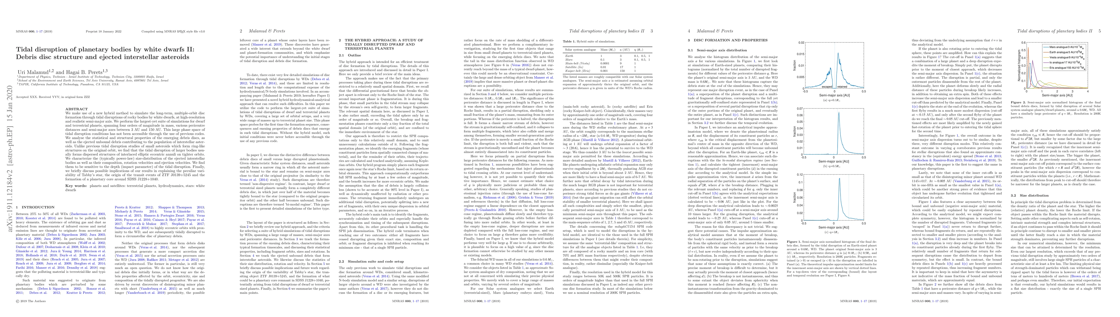This paper uses a new hybrid method to simulate tidal disruptions of planetary bodies by white dwarfs, revealing the formation of dispersed debris discs and ejected interstellar asteroids. The study finds that larger bodies typically create complex, interlaced elliptical structures rather than simple rings, and characterizes the ejected bodies' size, composition, and velocities, which are influenced by the disruption depth.