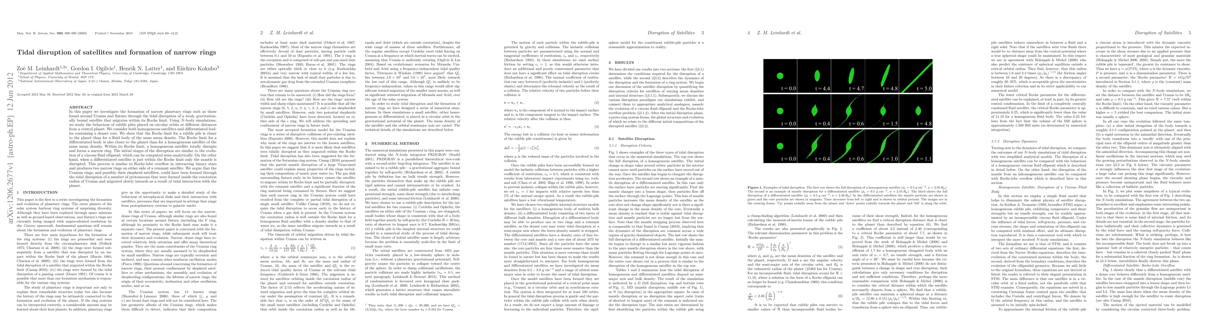 This paper explores the formation of narrow planetary rings via the tidal disruption of weak, gravitationally bound satellites within their Roche limit, using $N$-body simulations. It finds that rubble piles and differentiated bodies disrupt closer to the planet than homogeneous bodies, leading to the formation of narrow rings, with differentiated bodies producing two rings from mantle disruption.