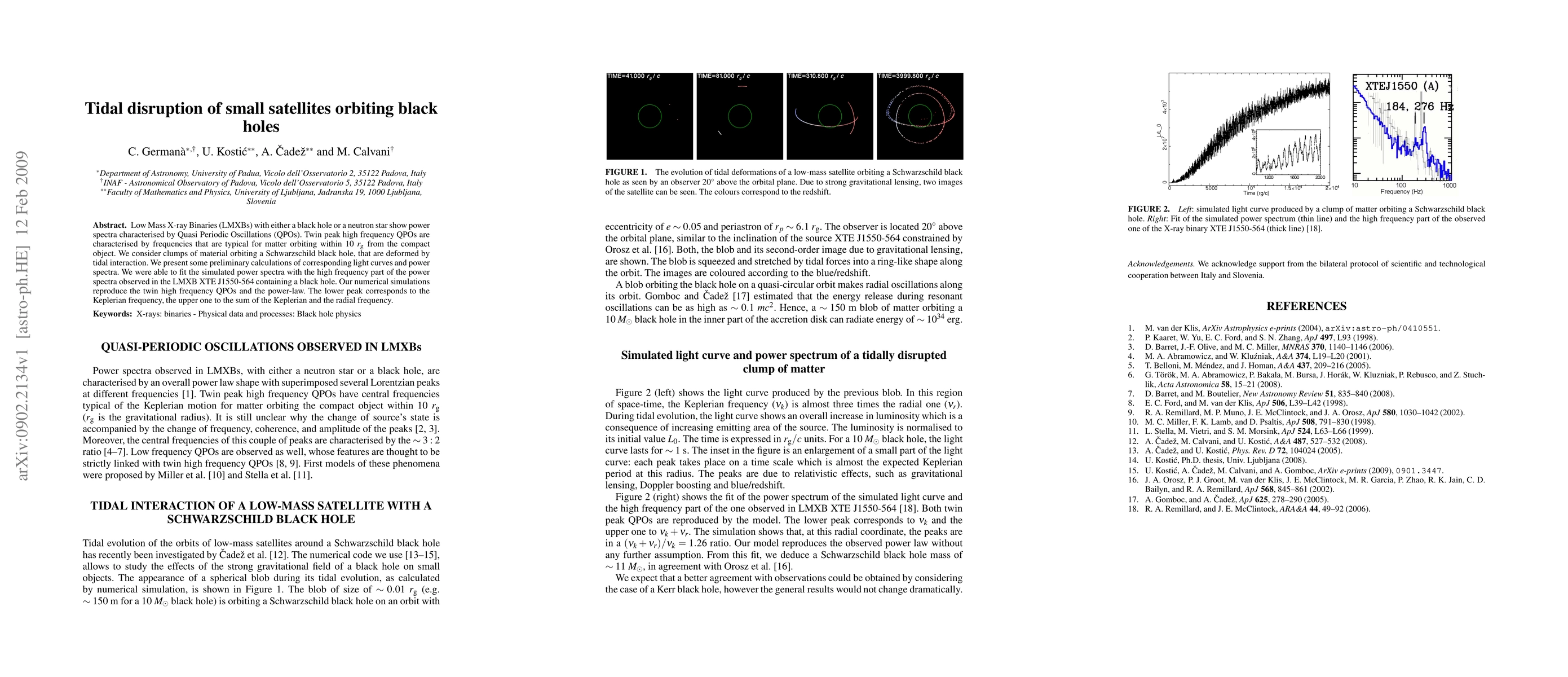 Low Mass X-ray Binaries (LMXBs) with either a black hole or a neutron star show power spectra characterised by Quasi Periodic Oscillations (QPOs). Twin peak high frequency QPOs are characterised by frequencies that are typical for matter orbiting within 10 r_g from the compact object. We consider clumps of material orbiting a Schwarzschild black hole, that are deformed by tidal interaction. We present some preliminary calculations of corresponding light curves and power spectra. We were able to fit the simulated power spectra with the high frequency part of the power spectra observed in the LMXB XTE J1550-564 containing a black hole. Our numerical simulations reproduce the twin high frequency QPOs and the power-law. The lower peak corresponds to the Keplerian frequency, the upper one to the sum of the Keplerian and the radial frequency.