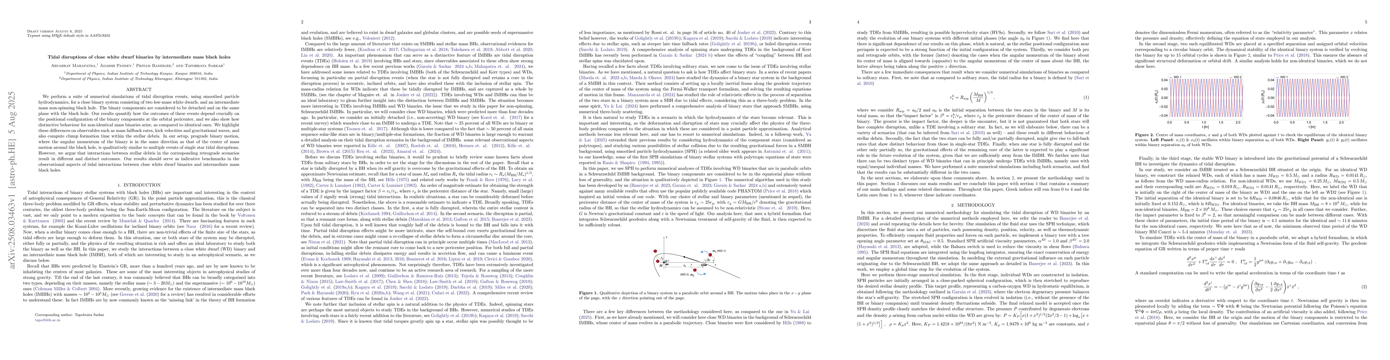 The paper presents detailed numerical simulations using SPH to model tidal disruptions of white dwarf binaries by intermediate mass black holes, providing insights into observable features of such events.