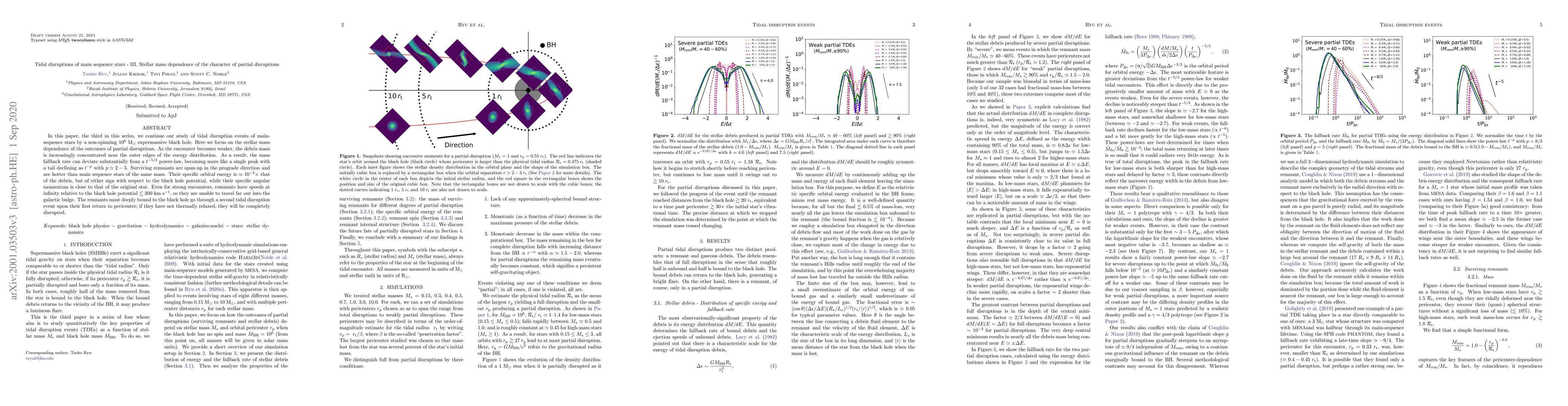 In this paper, the third in this series, we continue our study of tidal disruption events of main-sequence stars by a non-spinning $10^{6}~\rm{M}_\odot$ supermassive black hole. Here we focus on the stellar mass dependence of the outcomes of partial disruptions. As the encounter becomes weaker, the debris mass is increasingly concentrated near the outer edges of the energy distribution. As a result, the mass fallback rate can deviate substantially from a $t^{-5/3}$ power-law, becoming more like a single peak with a tail declining as $t^{-p}$ with $p\simeq2-5$. Surviving remnants are spun-up in the prograde direction and are hotter than main sequence stars of the same mass. Their specific orbital energy is $\simeq10^{-3}\times$ that of the debris, but of either sign with respect to the black hole potential, while their specific angular momentum is close to that of the original star. Even for strong encounters, remnants have speeds at infinity relative to the black hole potential $\lesssim 300$ km s$^{-1}$, so they are unable to travel far out into the galactic bulge. The remnants most deeply bound to the black hole go through a second tidal disruption event upon their first return to pericenter; if they have not thermally relaxed, they will be completely disrupted.