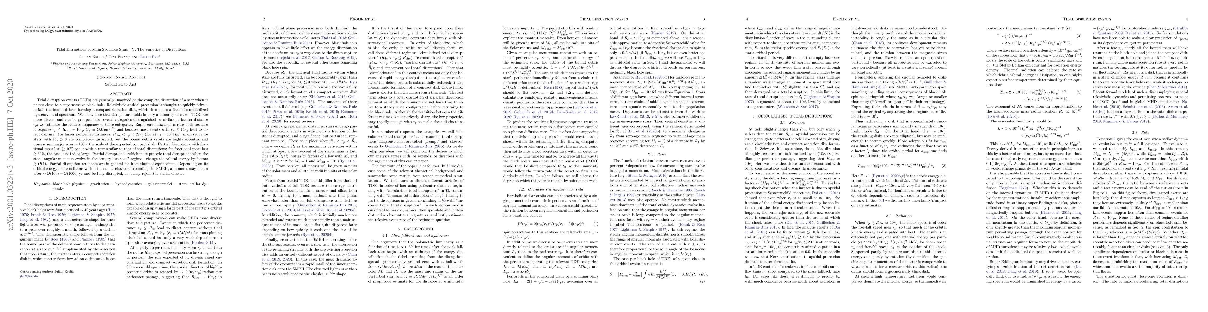 Tidal disruption events (TDEs), events in which a star passes very close to a supermassive black hole, are generally imagined as leading either to the star's complete disruption or to its passage directly into the black hole. In the former case it is widely believed that in all cases the bound portion of the debris quickly "circularizes" due to relativistic apsidal precession, i.e., forms a compact accretion disk, and emits a flare of standardized lightcurve and spectrum. We show here that TDEs are more diverse and can be grouped into several distinct categories on the basis of stellar pericenter distance $r_p$; we calculate the relative frequency of these categories. In particular, because rapid circularization requires $r_p \lesssim 10r_g$ ($r_g \equiv GM_{\rm BH}/c^2$), it can happen in only a minority of total disruptions, $\lesssim 1/4$ when the black hole has mass $M_{\rm BH} = 10^6 M_\odot$. For larger pericenter distances, $10 < r_p/r_g < 27$ (for $M_{\rm BH}=10^6M_\odot$), main sequence stars are completely disrupted, but the bound debris orbits are highly eccentric and possess semimajor axes $\sim 100\times$ the scale of the expected compact disk. Partial disruptions with fractional mass-loss $\gtrsim 10\%$ should occur with a rate similar to that of total disruptions; for fractional mass-loss $\gtrsim 50\%$, the rate is $\approx 1/3$ as large. Partial disruptions -- which must precede total disruptions when the stars' angular momenta evolve in the "empty loss-cone" regime -- change the orbital energy by factors $\gtrsim O(1)$. Remnants of partial disruptions are in general far from thermal equilibrium. Depending on the orbital energy of the remnant and conditions within the stellar cluster surrounding the SMBH, it may return after hundreds or thousands of years and be fully disrupted, or it may rejoin the stellar cluster.