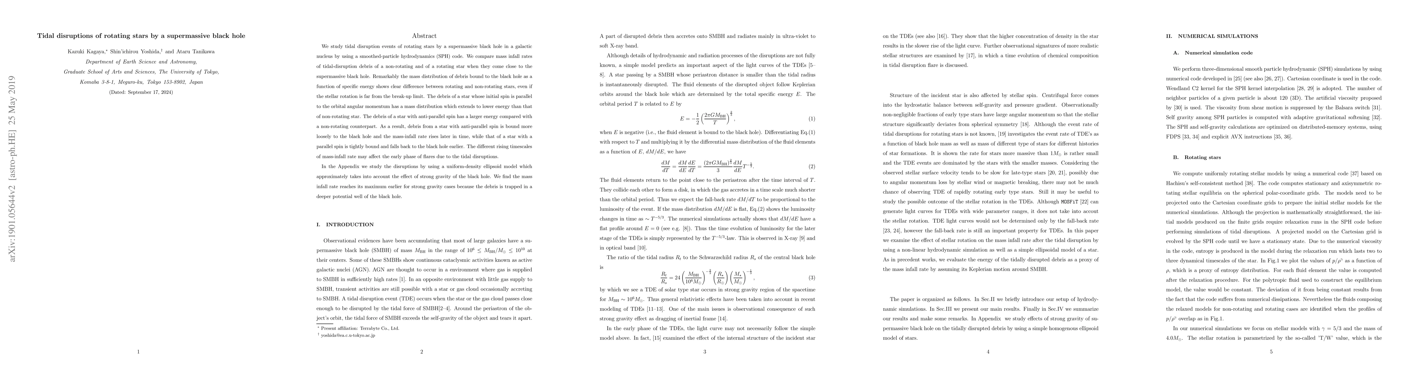 This paper investigates tidal disruption events of rotating stars by supermassive black holes using SPH simulations, revealing that the mass distribution of debris differs significantly between rotating and non-rotating stars. Stars with spin parallel to orbital angular momentum have debris that falls back earlier, while those with anti-parallel spin have debris that binds more loosely and falls back later, affecting the early phase of tidal disruption flares.