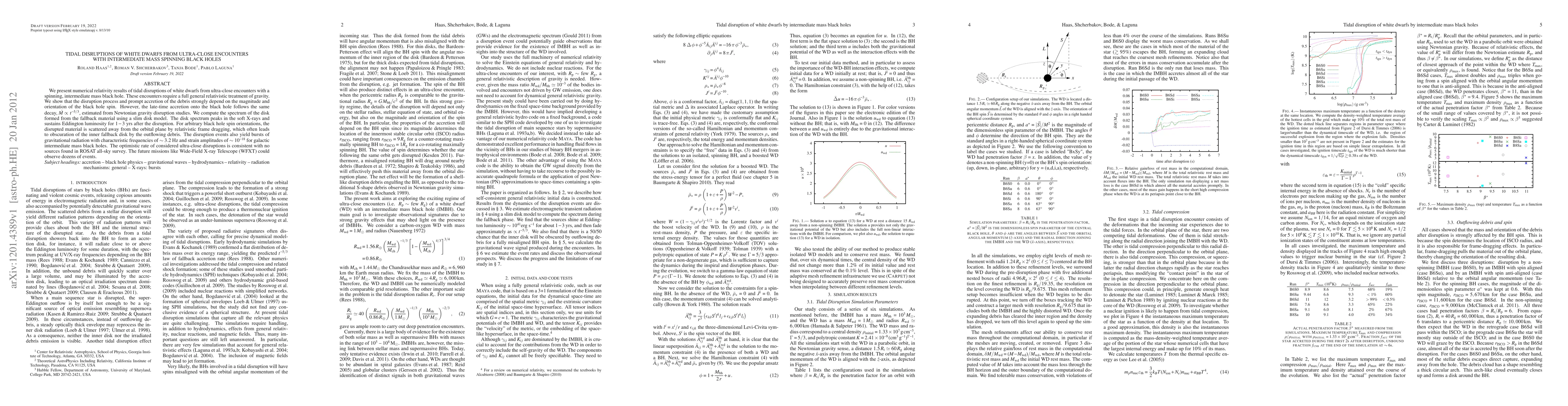 This paper uses numerical relativity to study tidal disruptions of white dwarfs by spinning intermediate mass black holes, showing that the disruption and accretion processes depend on the black hole's spin. The late-time accretion follows a Newtonian decay law, while the disk spectrum peaks in soft X-rays and could be observed by future telescopes like WFXT.