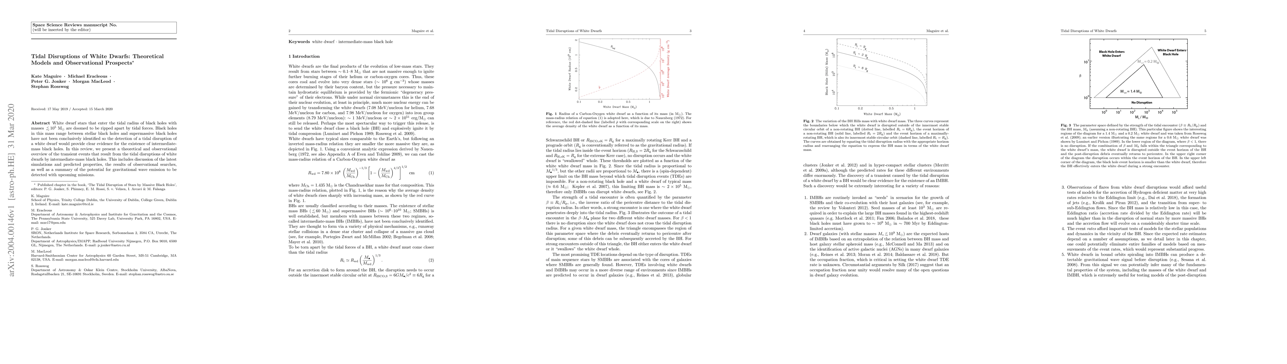 This paper reviews theoretical models and observational prospects for tidal disruptions of white dwarfs by intermediate-mass black holes, emphasizing the potential for such events to provide evidence for the existence of these elusive black holes and discussing the latest simulations, observational searches, and prospects for gravitational wave detections.