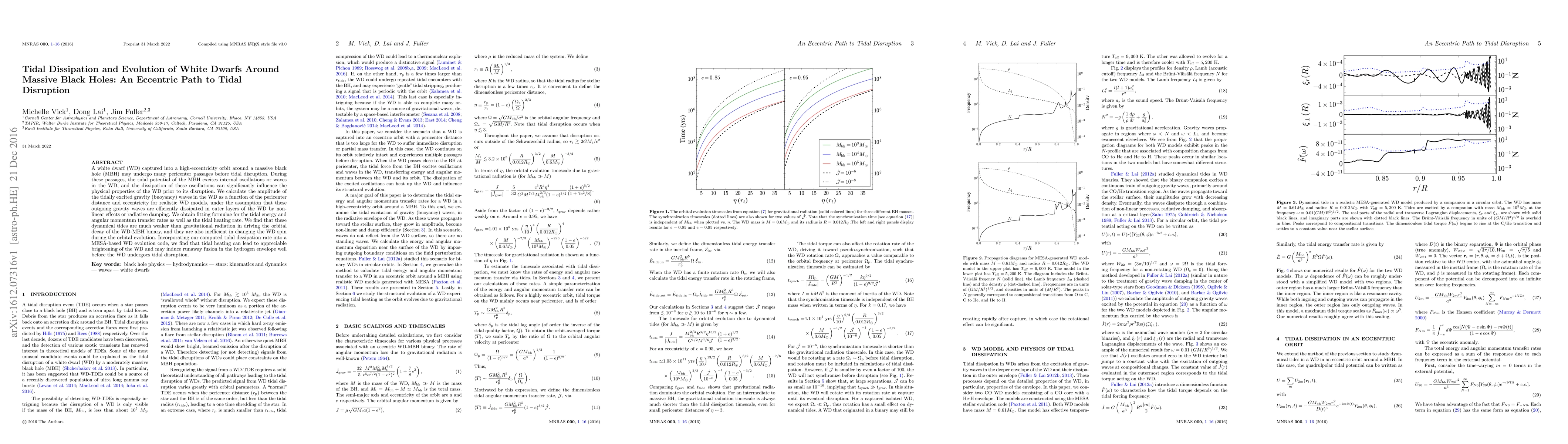 This paper investigates the tidal dissipation effects on white dwarfs (WD) in high-eccentricity orbits around massive black holes (MBH), finding that tidal heating can significantly brighten the WD and potentially induce runaway fusion before disruption. The study derives fitting formulae for tidal energy and angular momentum transfer rates, showing that dynamical tides are less effective than gravitational radiation in orbital decay and spin change.
