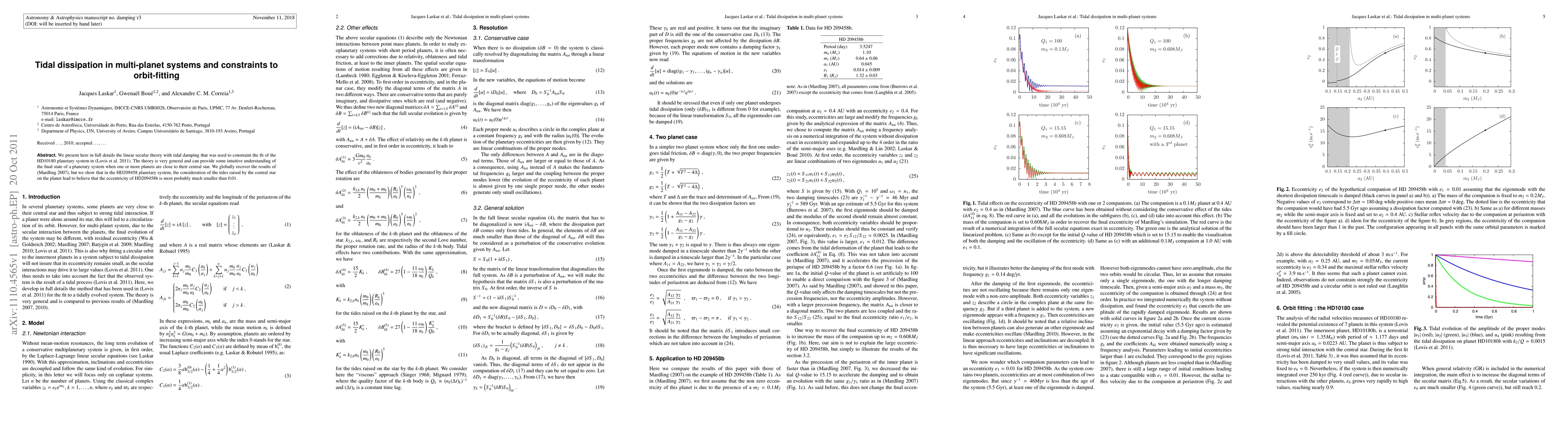 We present here in full details the linear secular theory with tidal damping that was used to constraint the fit of the HD10180 planetary system in (Lovis et al. 2011). The theory is very general and can provide some intuitive understanding of the final state of a planetary system when one or more planets are close to their central star. We globally recover the results of (Mardling 2007), but we show that in the HD209458 planetary system, the consideration of the tides raised by the central star on the planet lead to believe that the eccentricity of HD209458b is most probably much smaller than 0.01.