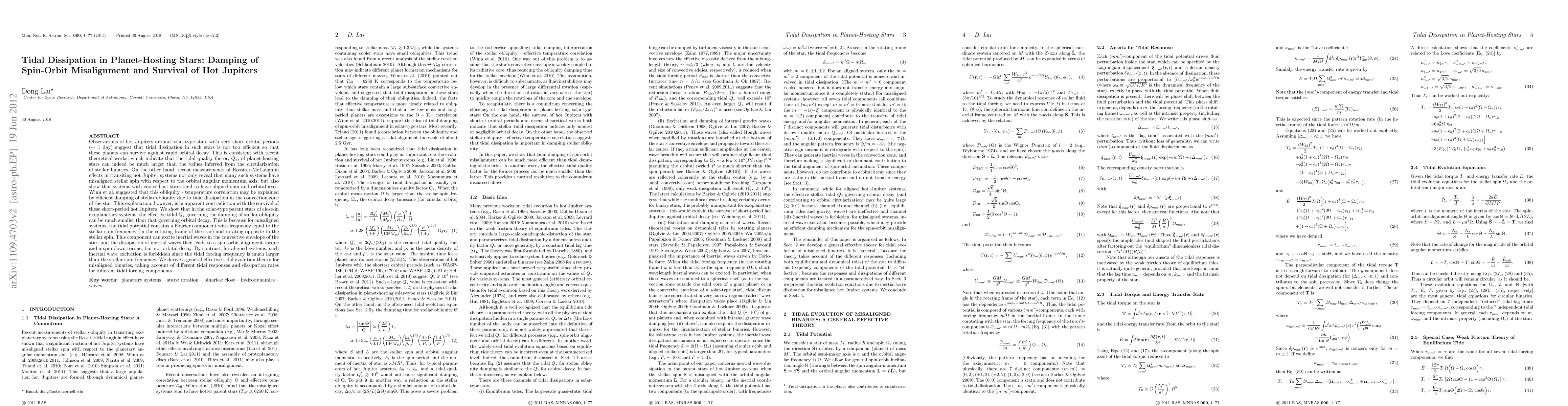 This paper explores how tidal dissipation in planet-hosting stars can explain the damping of spin-orbit misalignment in hot Jupiter systems without causing rapid orbital decay. It proposes that the effective tidal Q for damping obliquity is much smaller than that for orbital decay, allowing for the survival of these planets.