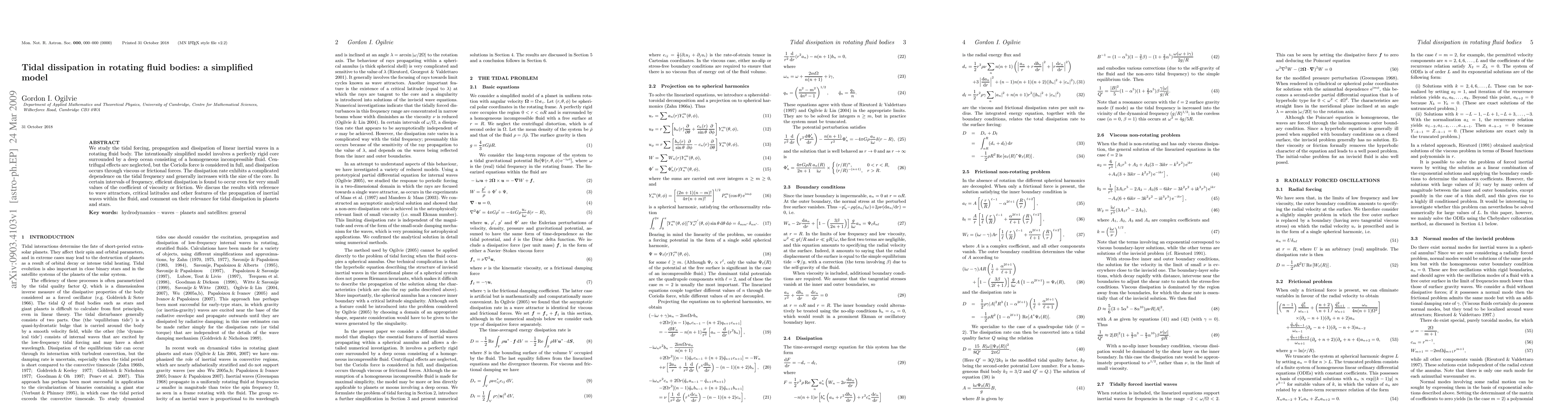 This paper presents a simplified model to study tidal dissipation in rotating fluid bodies, focusing on linear inertial waves in a rigid core surrounded by a deep ocean. The model highlights the complex relationship between dissipation rate, tidal frequency, and core size, revealing efficient dissipation even with minimal viscosity.