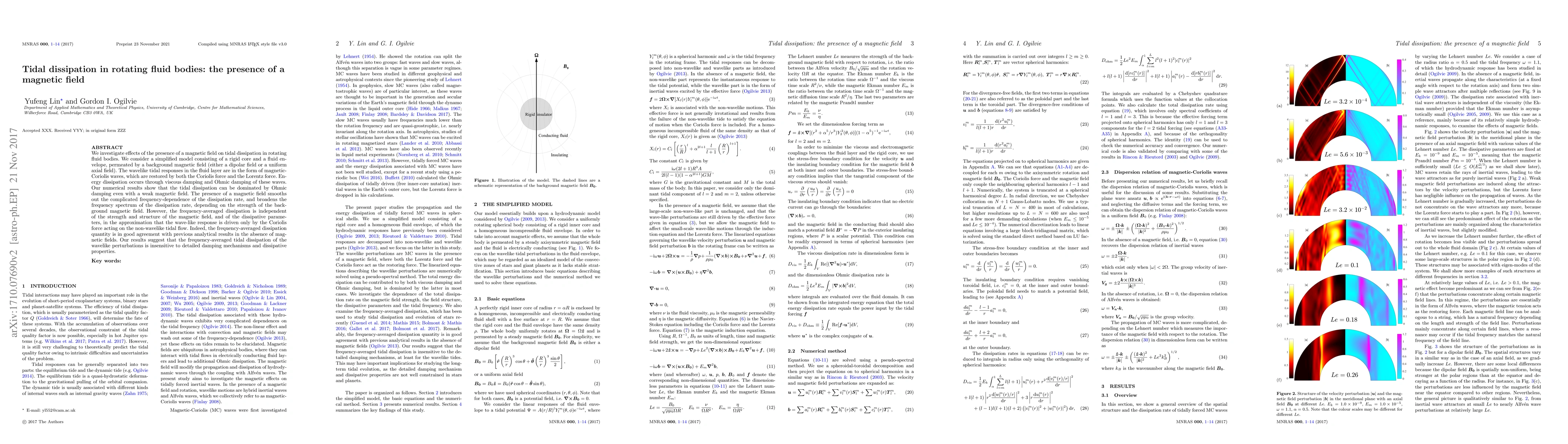 The paper presents a numerical study of tidal dissipation in rotating fluid bodies with magnetic fields, identifying the dominant role of Ohmic damping and the insensitivity of frequency-averaged dissipation to magnetic field properties.