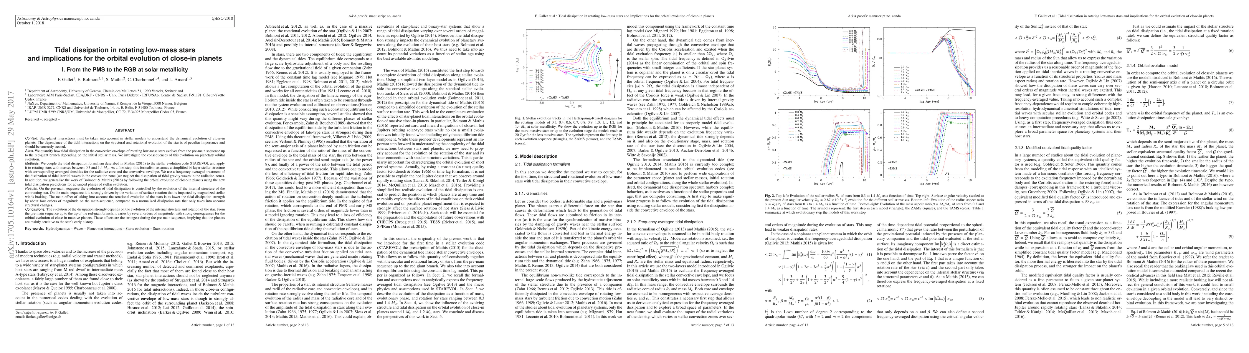 This paper examines tidal dissipation in rotating low-mass stars from pre-main sequence to red-giant branch, highlighting its impact on the orbital evolution of close-in planets. The study shows that tidal dissipation varies significantly with stellar evolution, especially due to rotational changes, affecting planetary orbits most during the star's early history.
