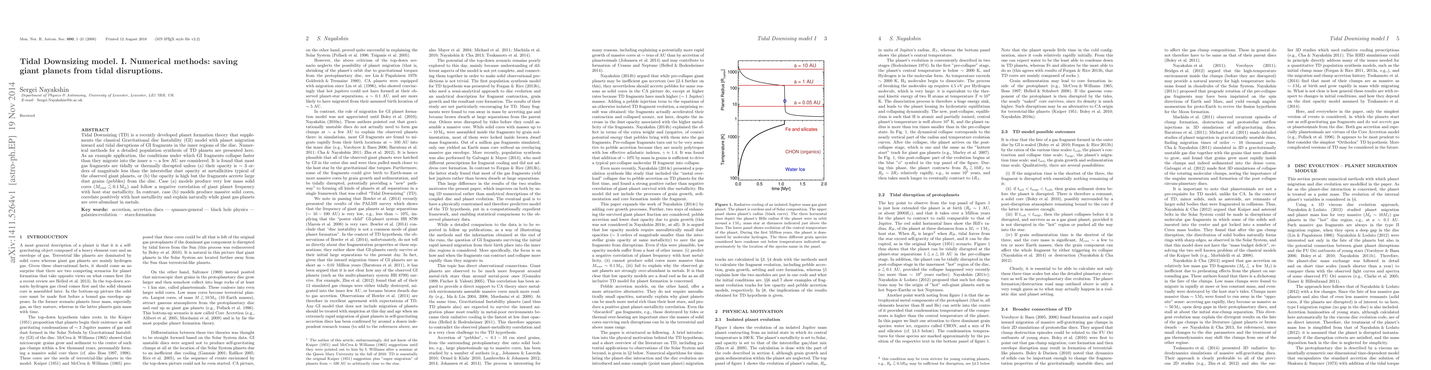 This paper introduces numerical methods for studying Tidal Downsizing (TD) models, which combine Gravitational Disc Instability and planet migration, to prevent tidal disruptions of giant planets. It finds that most gas fragments are disrupted unless their opacity is significantly lower than interstellar dust or they accrete large grains, leading to different mass cores and correlations with host star metallicity.