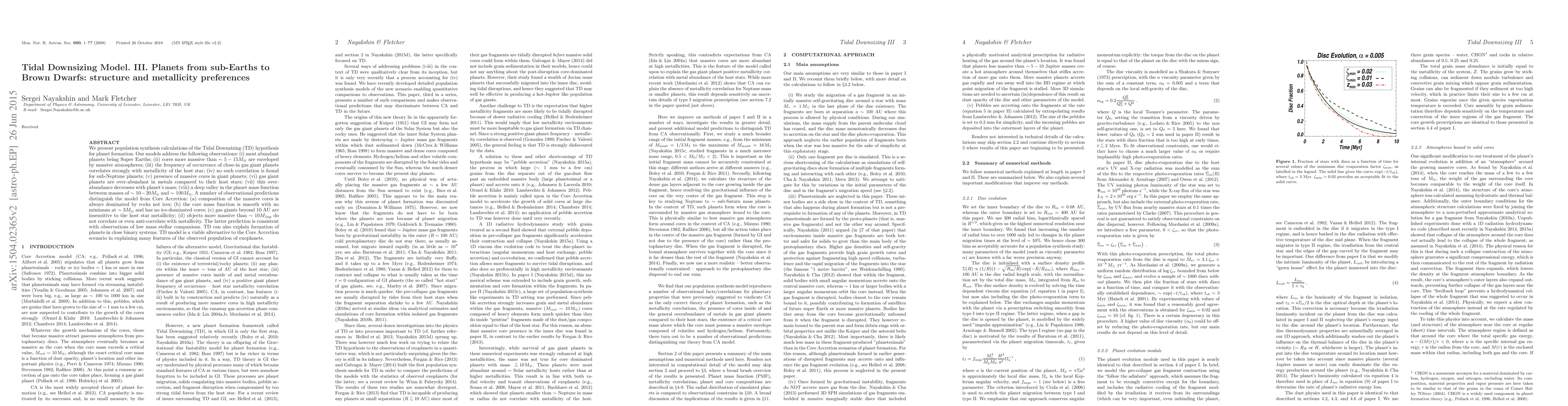 We present population synthesis calculations of the Tidal Downsizing (TD) hypothesis for planet formation. Our models address the following observations: (i) most abundant planets being Super Earths; (ii) cores more massive than $\sim 5-15 M_\oplus$ are enveloped by massive atmospheres; (iii) the frequency of occurrence of close-in gas giant planets correlates strongly with metallicity of the host star; (iv) no such correlation is found for sub-Neptune planets; (v) presence of massive cores in giant planets; (vi) gas giant planets are over-abundant in metals compared to their host stars; (vii) this over-abundance decreases with planet's mass; (viii) a deep valley in the planet mass function between masses of $\sim 10-20 M_\oplus$ and $\sim 100 M_\oplus$. A number of observational predictions distinguish the model from Core Accretion: (a) composition of the massive cores is always dominated by rocks not ices; (b) the core mass function is smooth with no minimum at $\sim 3 M_\oplus$ and has no ice-dominated cores; (c) gas giants beyond 10 AU are insensitive to the host star metallicity; (d) objects more massive than $\sim 10 M_{\rm Jup}$ do not correlate or even anti-correlate with metallicity. The latter prediction is consistent with observations of low mass stellar companions. TD can also explain formation of planets in close binary systems. TD model is a viable alternative to the Core Accretion scenario in explaining many features of the observed population of exoplanets.